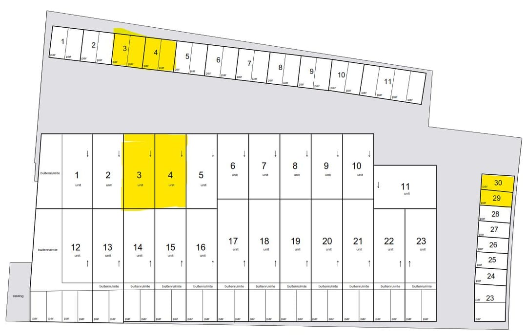 Bij elke unit horen 3 eigen parkeerplaatsen (2 voor de deur en 1 op de kop van het complex).