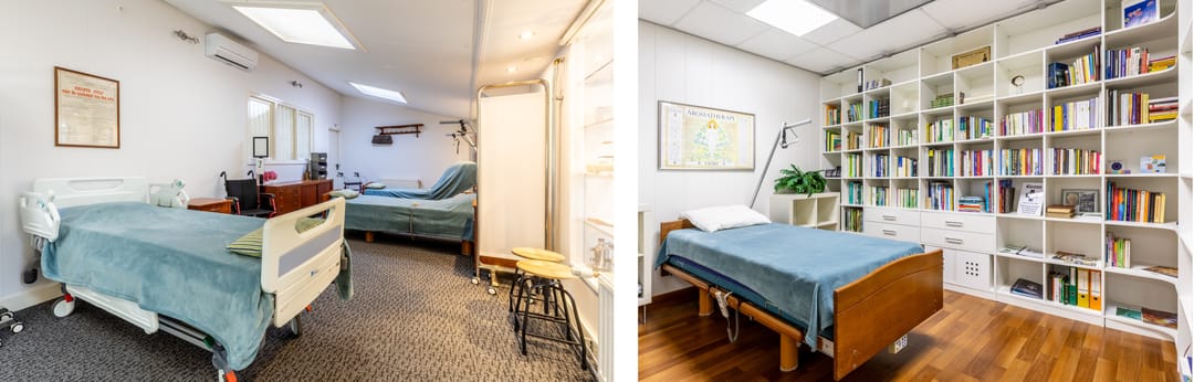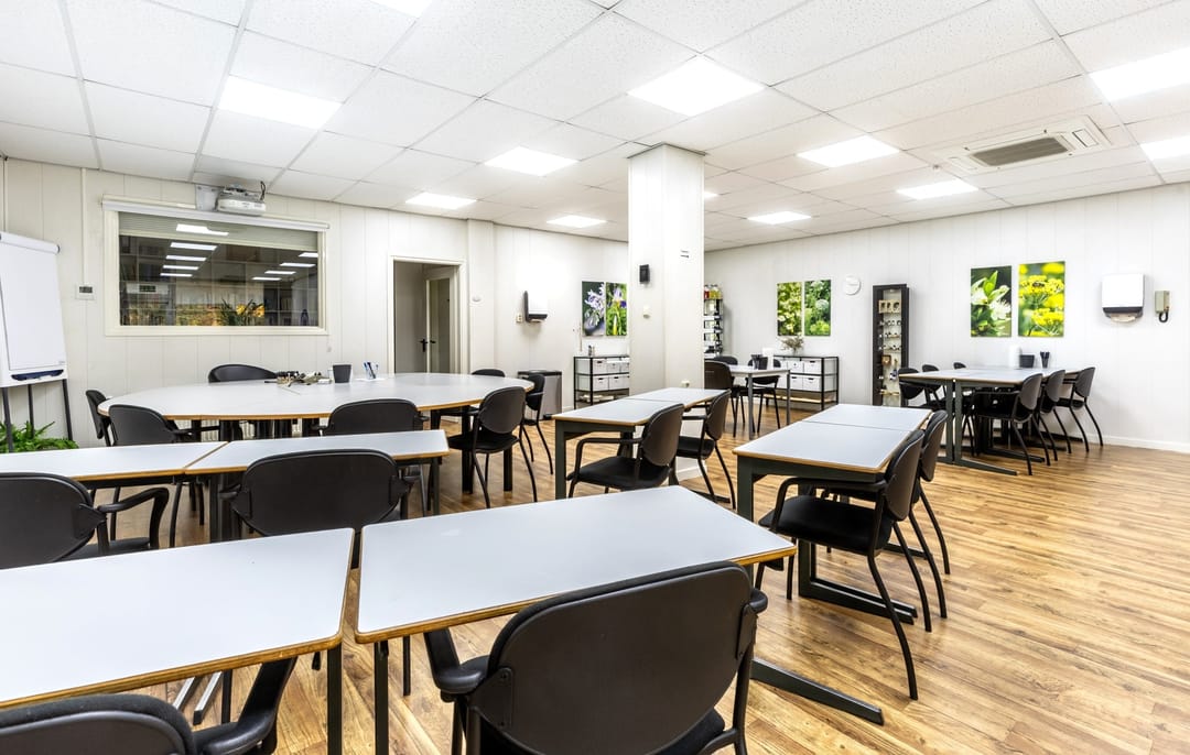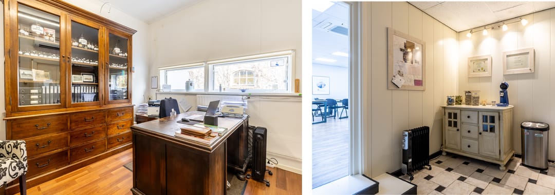 Een solide afgescheiden gedeelte (tussendeur aanwezig) is in 2020 verbouwd tot apart praktijklokaal dat aansluit op het grote (les)lokaal. Het is voorzien van CV, dubbel glas aan de buitenzijde, kozijnen met glas tussen beide loodsdelen en airco voor verwarmen en koelen.