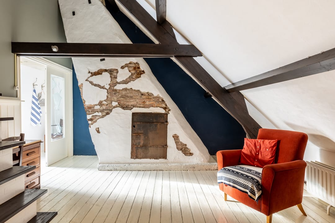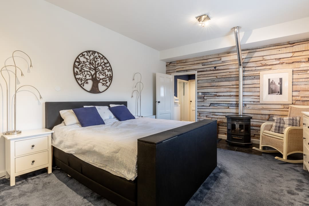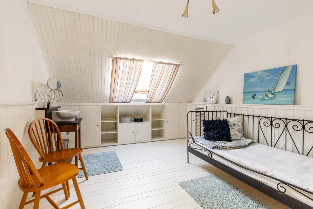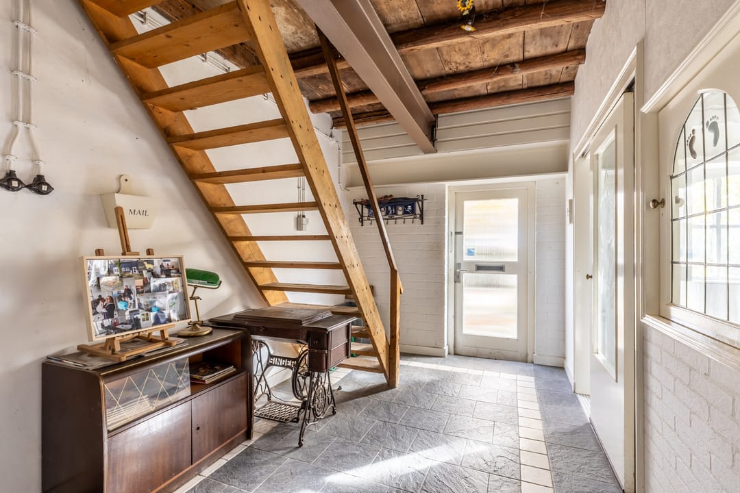 De grote opslagruimte erachter heeft veel hoogte, een gasheater, een separaat toilet en vaste trap naar de open verdieping met nog meer bergruimte, die zich middels een deur uitstrekt tot boven het grote lokaal beneden. In die laatste ruimte bevinden zich de beide omvormers van de zonnepanelen.