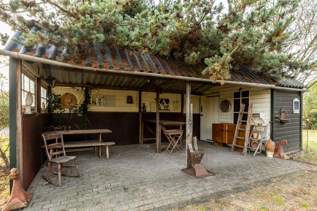 Aan de tuinzijde biedt het dak ruimte als buitenopslag. Een deel is nu in gebruik als beschutte zit (en rook)ruimte.