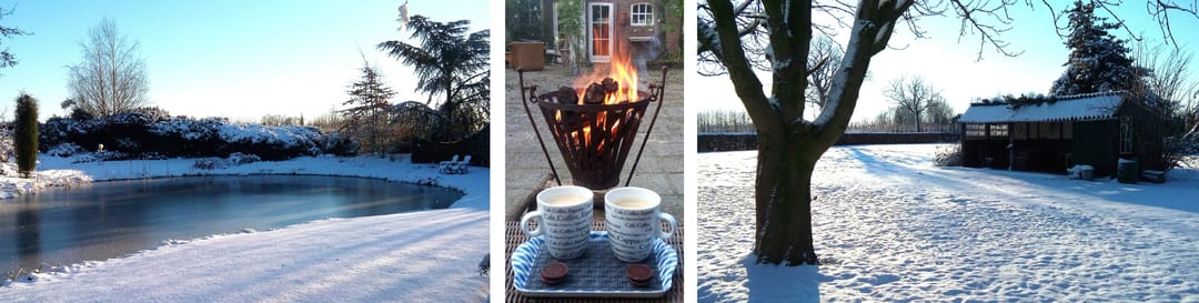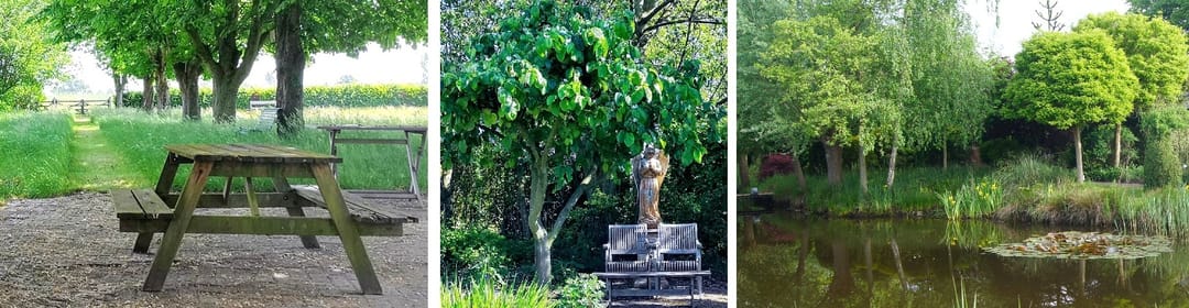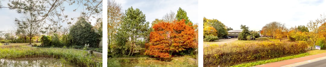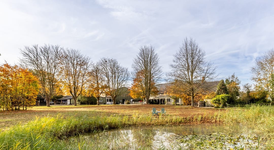 Vanuit de voorzijde van woning en annex, met terrassen en gezellige zitjes, is er een geweldig vrij uitzicht over de tuin, die verrassend makkelijk in onderhoud is. Het aantrekkelijke perceel van maar liefst 8.390 m² omvat gazonweides met natuurvijvers, omzoomd door bomen en struiken.