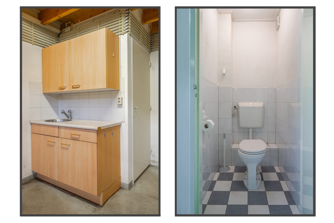 Entree middels overheaddeur, welke direct uitkomt in de bedrijfsruimte met pantry en toiletgroep.