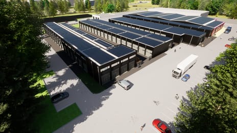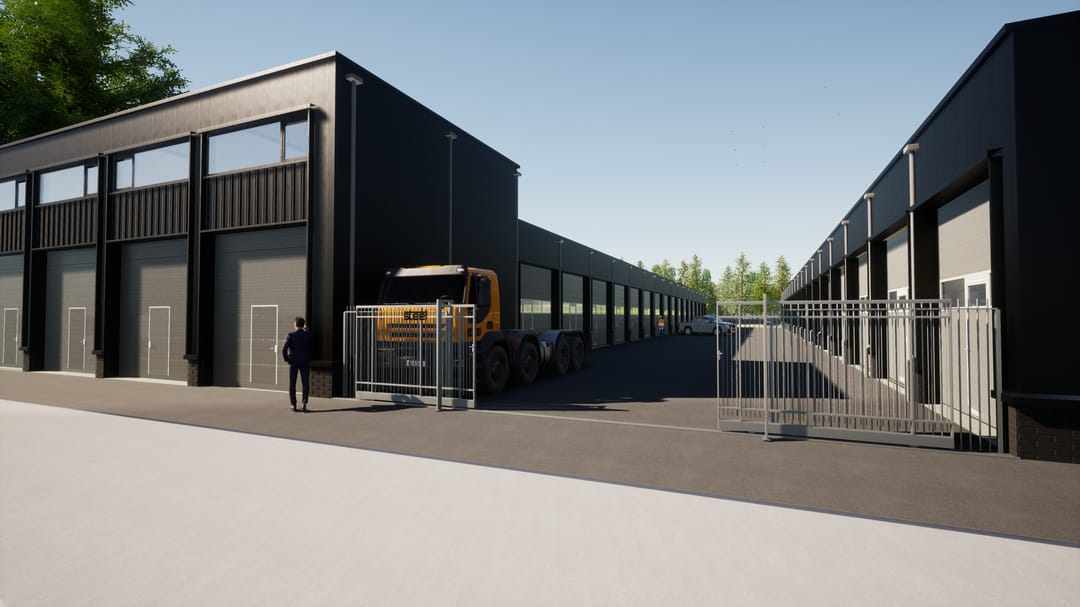 Betonvloer met betonvloer 8 cm. dik, sandwich gevelpanelen met bepaalde RC waarde, ventilatie-opening in dak en in overheaddeur. Hekwerk met elektrische schuifpoort voor units 1 t/m 34.