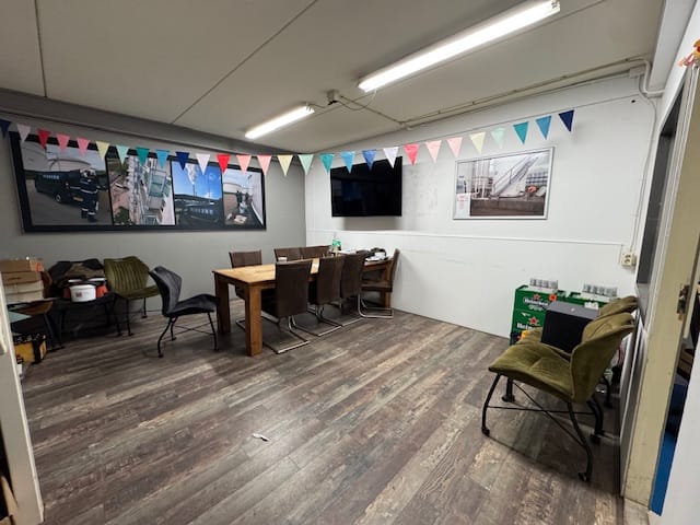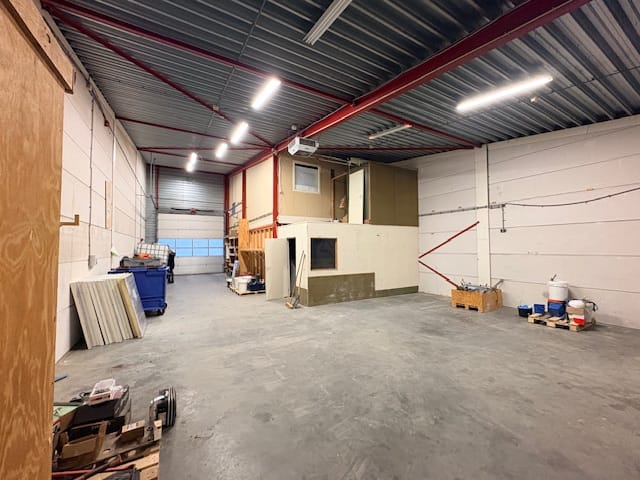 - Overheaddeuren, krachtstroom, betonvloer, toilet, pantry, inbouwarmaturen en te openen ramen