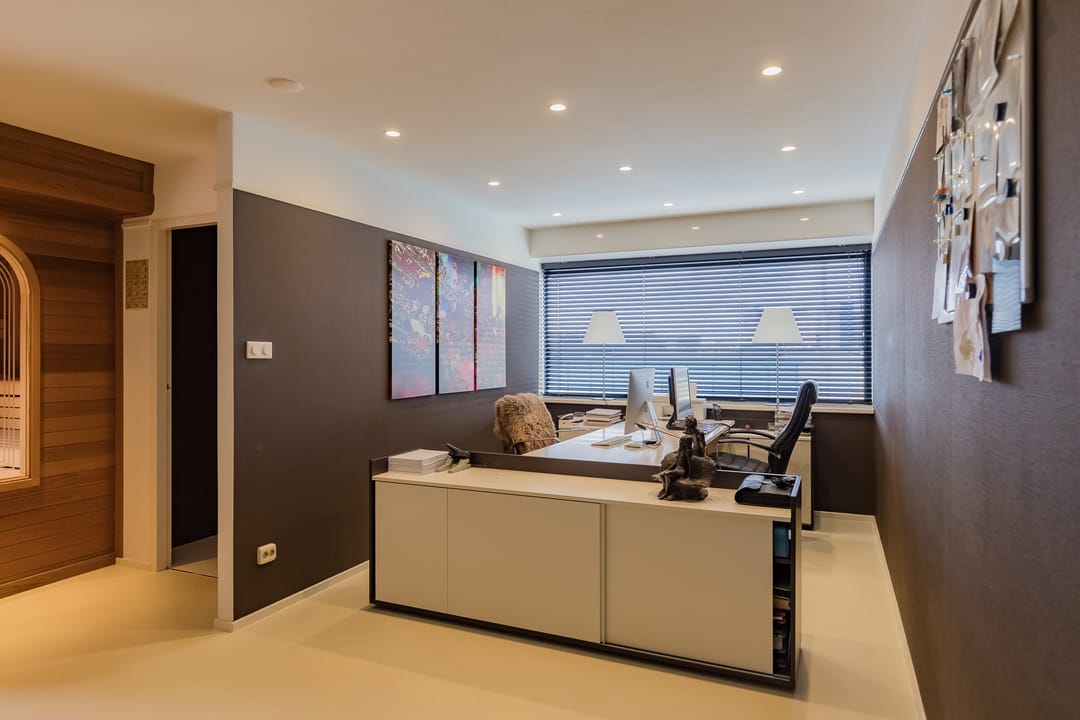 De indeling is als volgt: hal, 2x toilet en urinoir, in beide toiletten een wastafel in meubel, woonkeuken met keuken met inbouwapparatuur, woonkamer met open haard, 2 slaapkamers, kantoorkamer, inloopkast, luxe badkamer met ligbad/whirlpool, douche, toilet en dubbele wastafel in meubel, sauna.