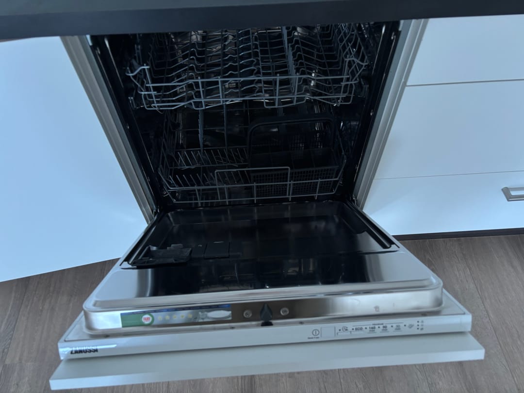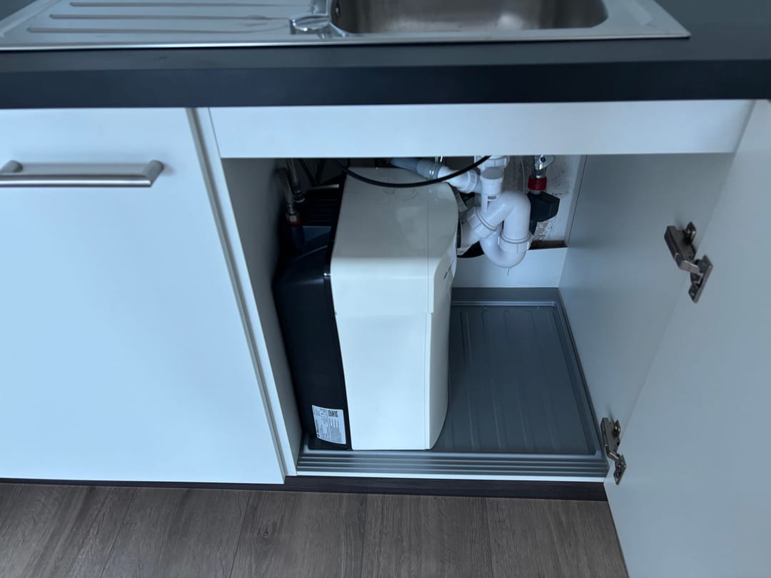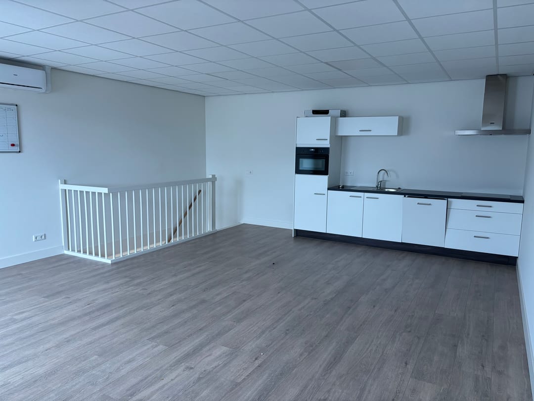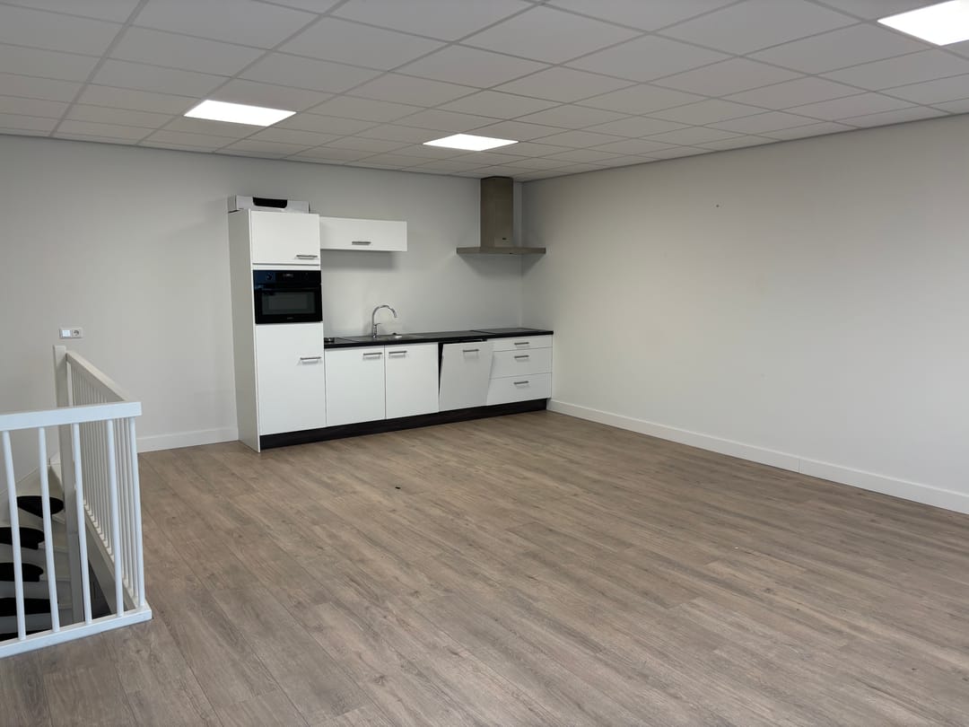 Via de trap bereikt u de 1e verd waar een compleet systeemplafond met verlichting aanwezig is, een fraai pvc vloer en een compleet uitgevoerde keuken.