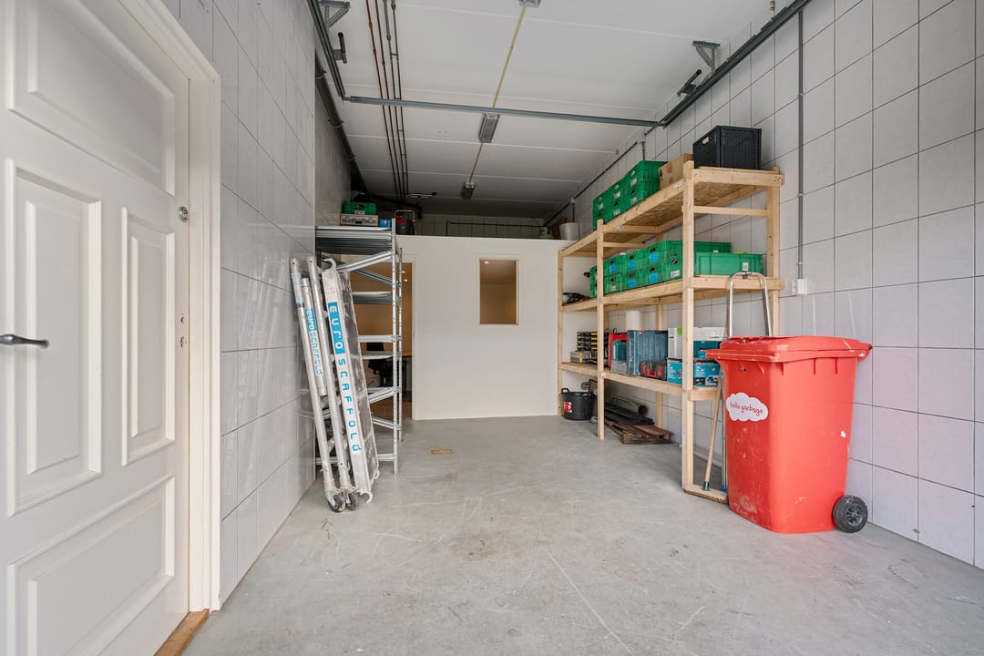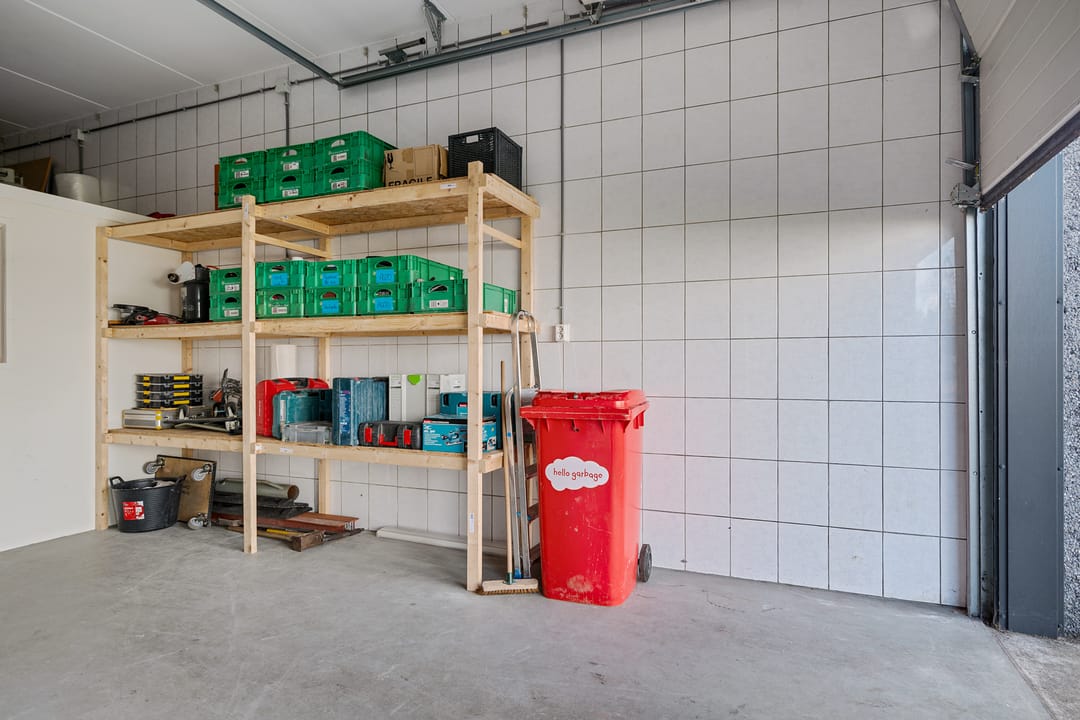 - Overheaddeuren, betonvloer, heater, toilet, pantry en te openen ramen