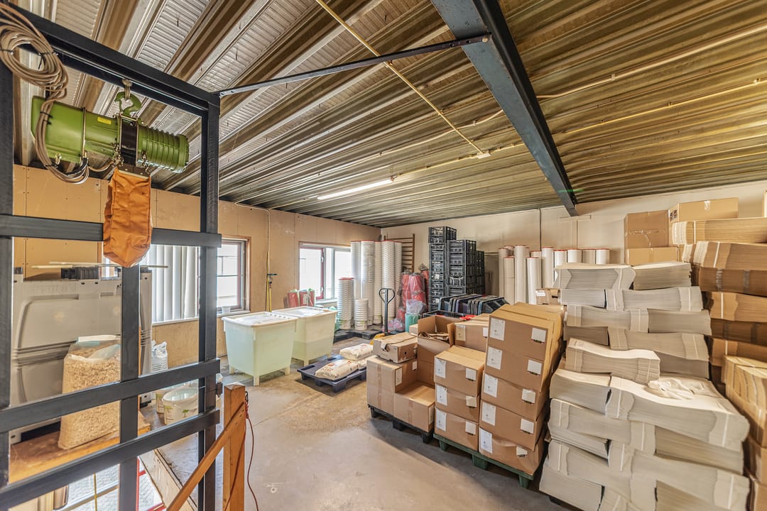 - Overheaddeuren, krachtstroom, betonvloer, toilet, pantry, inbouwarmaturen en te openen ramen