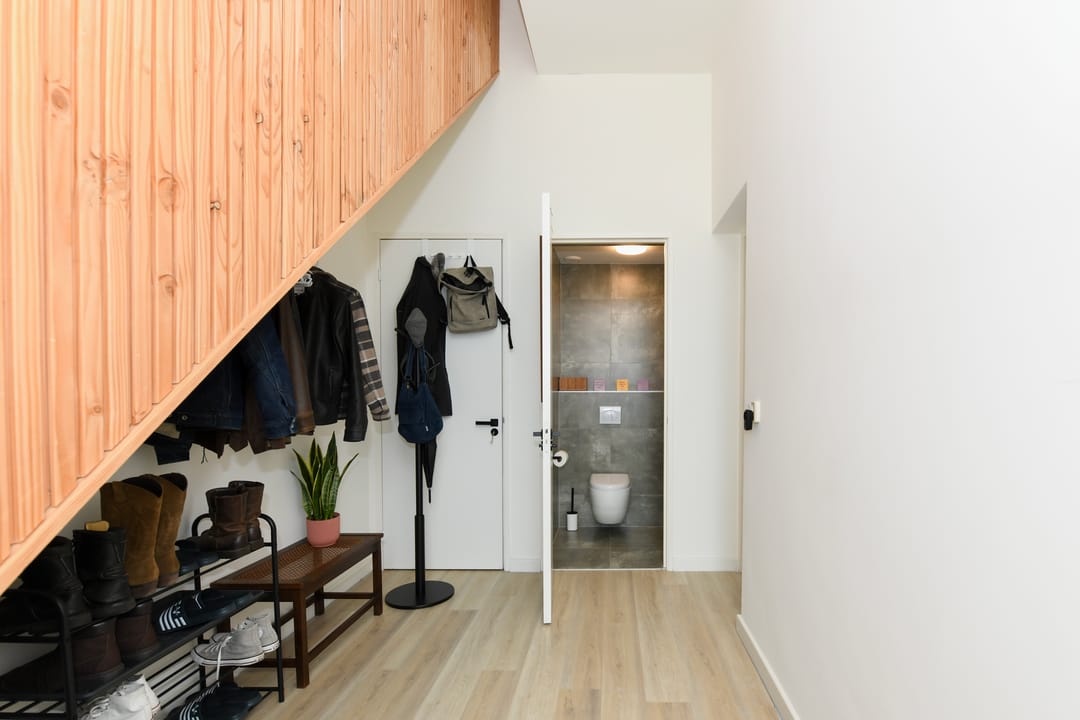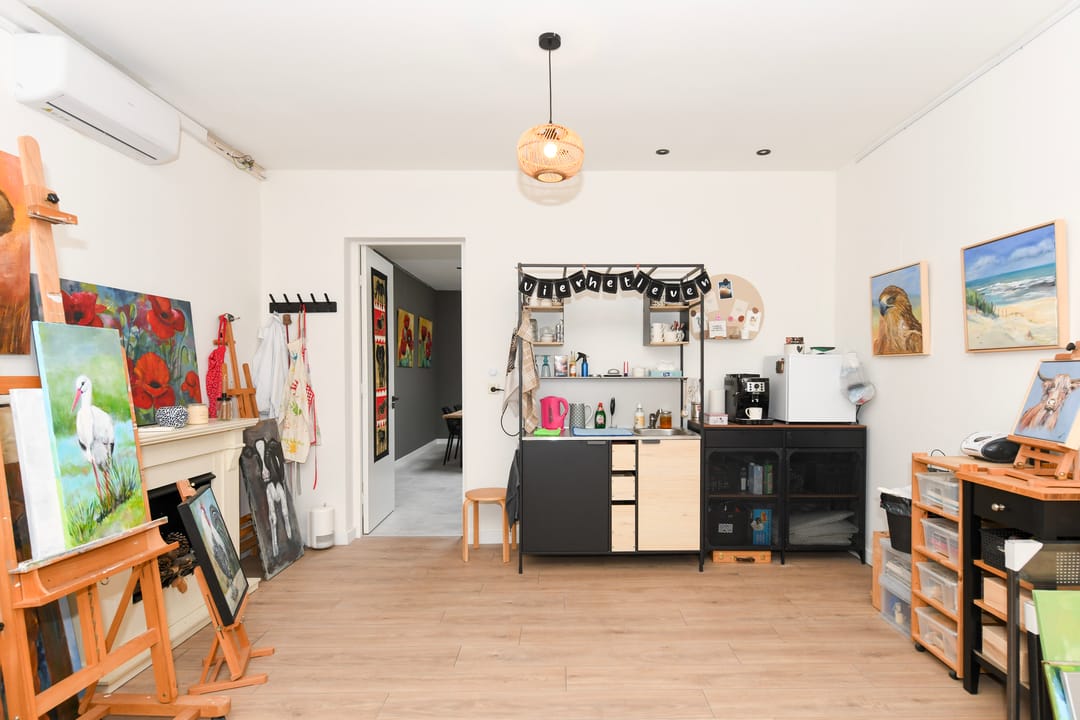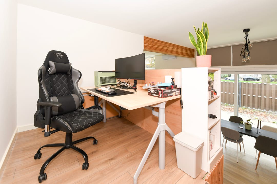 Het hoge plafond van maar circa 3,50 meter geeft de woonkamer een ruimtelijk en luxe gevoel. Op circa 1,50 meter hoogte is een stijlvolle werkplek gerealiseerd, visueel afgescheiden maar perfect geïntegreerd in de leefruimte.