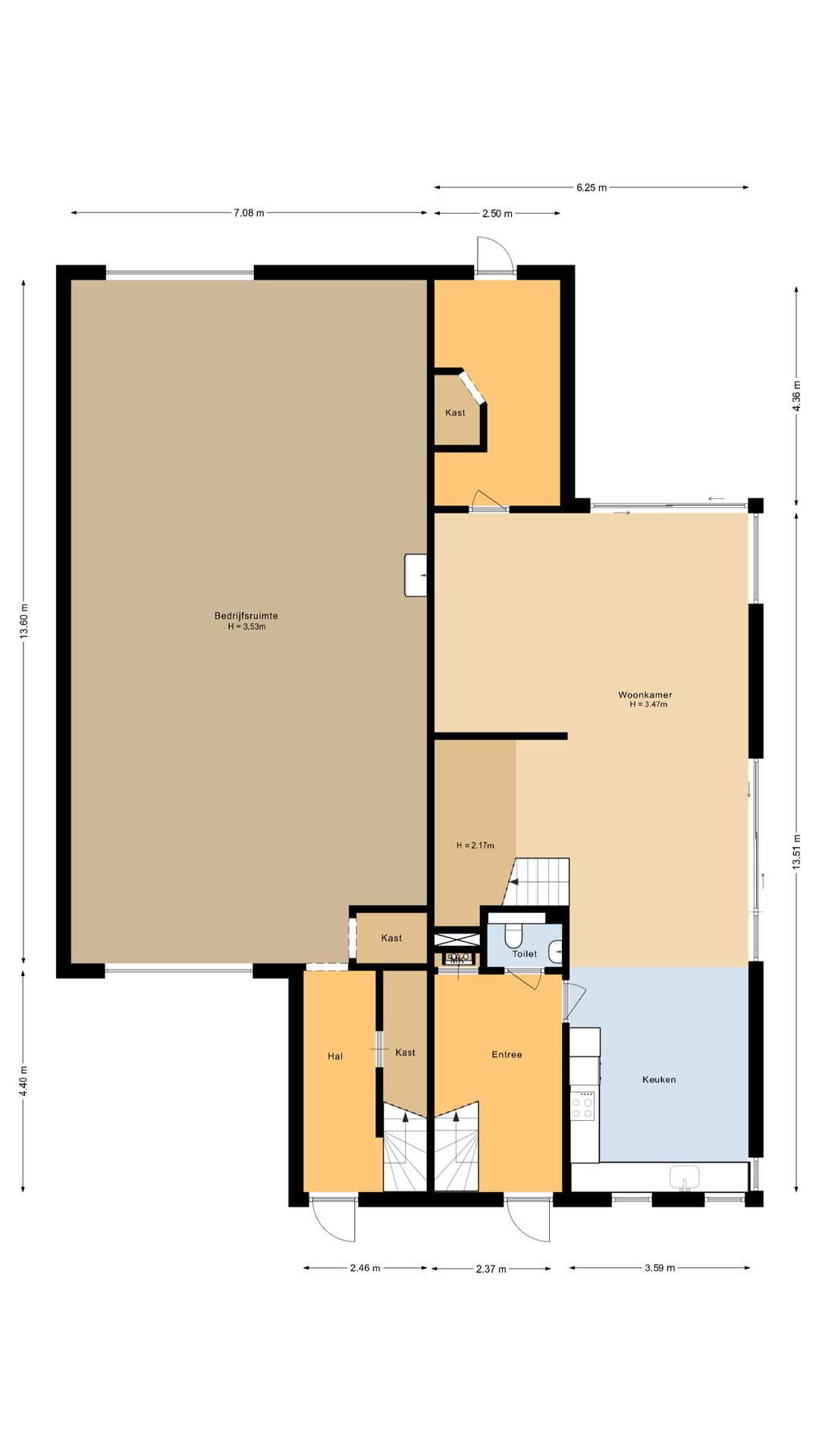 • Bedrijfshal circa 96 m2, kantoorruimten en gezamenlijk deel circa 129 m2, woonhuis circa 169 m2