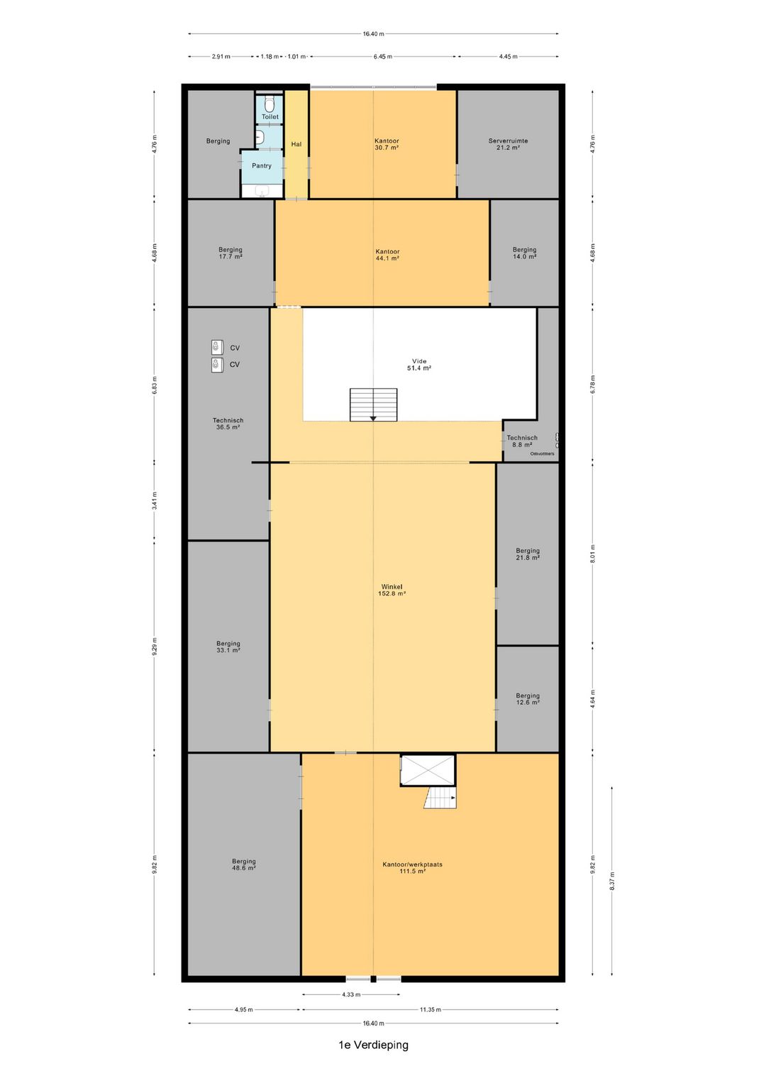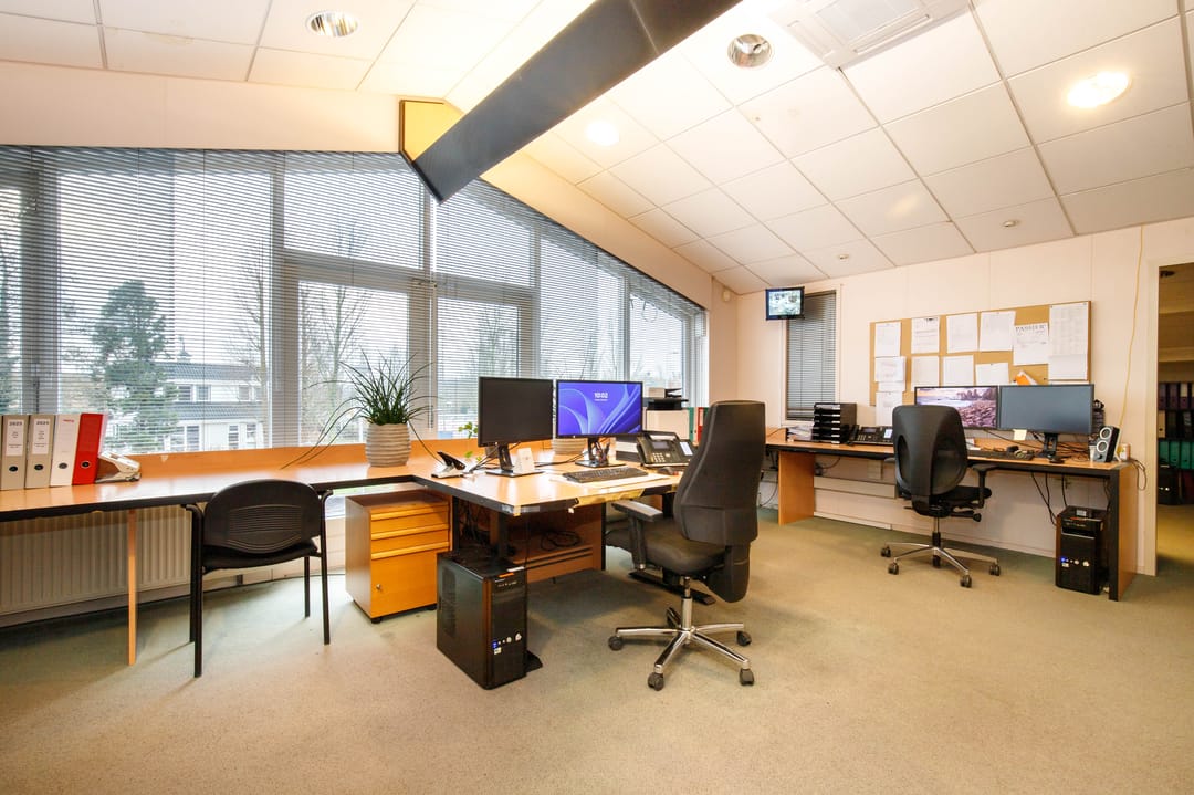 De kantoorruimte ligt op de verdieping en heeft een vloeroppervlakte van 75 m2, de serverruimte bedraagt 21 m2, de kantine en toiletten zijn circa 15 m2. De bergruimten onder het schuine deel van het dak zijn 32 m2.