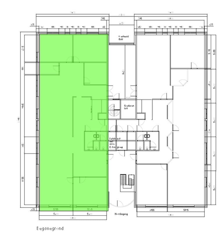 - ca. 319 m² vvo kantoor- en bedrijfsruimte op de begane grond, links.