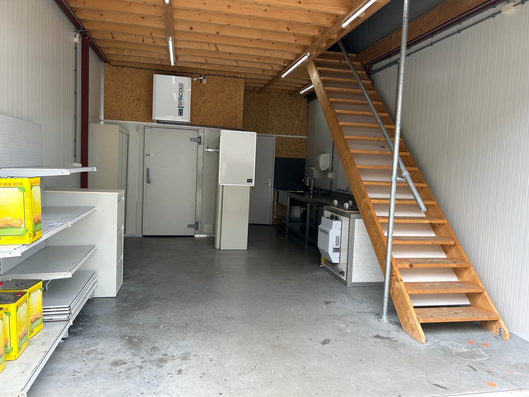 Begane grond: (ca. 39m²) bedrijfsruimte met betonvloer, elektrisch bedienbare overheaddeur, koelcel, meterkast, keukenblok met boiler t.b.v. war, water, toilet en vaste trap naar verdieping.