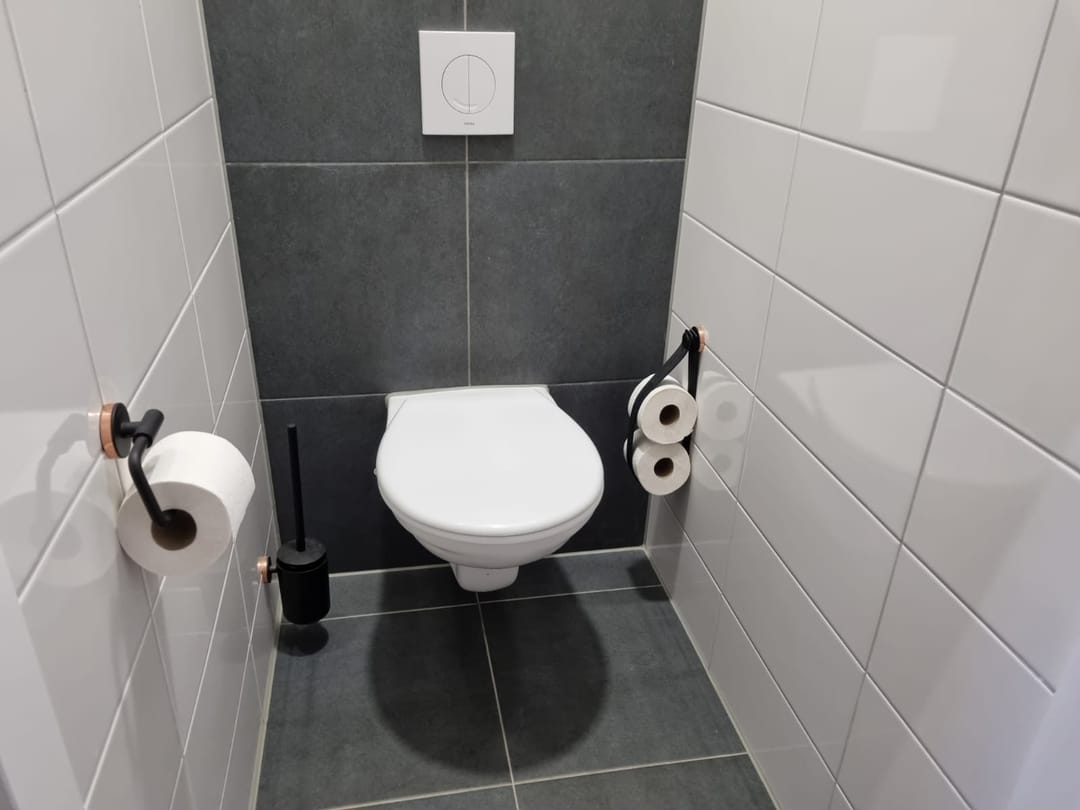 - Toilet v.v. wand- en vloertegels, lichtpunt met sensor en hangcloset