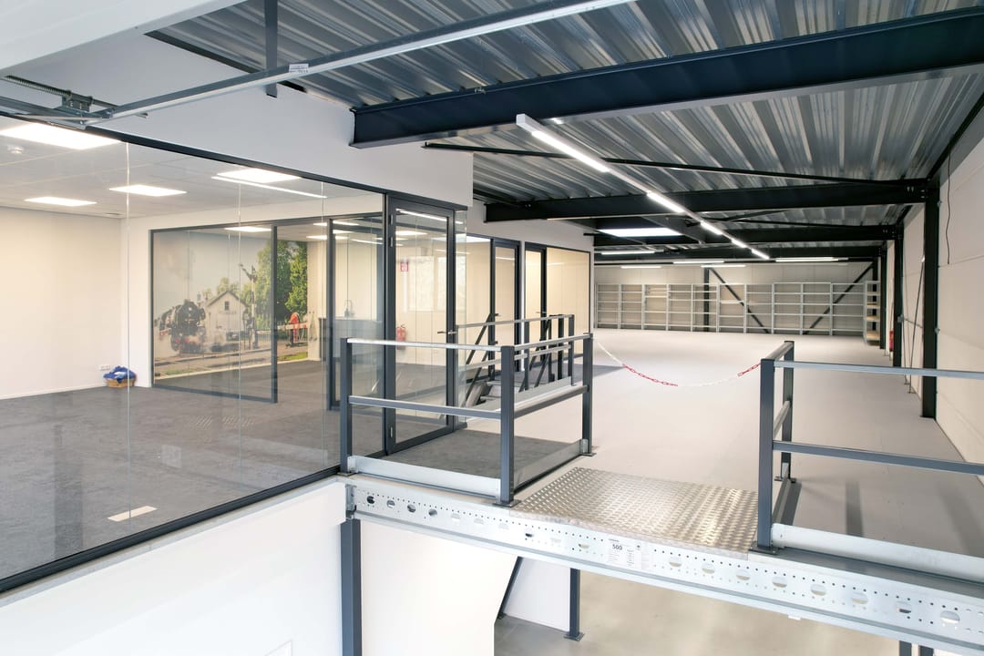 Op de bijna gehele bevloerde eerste verdieping bevinden zich meerdere lichte en ruime kantoren, stijlvol uitgevoerd met scheidingswanden en deuren voorzien van veiligheidsglas in zwart stalen frames. Deze ruimtes zijn voorzien van een mooie en kwalitatief sterke vloerbekleding. In de vloer zijn op enkele plekken stopcontacten geplaatst en ook de kabels zijn keurig weggewerkt in de vloer en wanden. Daarnaast is de hoogte voldoende om stellingen te plaatsen en/of werkruimte te creëren. De vloer boven de bedrijfshal is bij de overheaddeur zodanig uitgerust dat pallets eenvoudig vanaf de begane grond op de verdieping kunnen worden getild met behulp van een heftruck. Zowel op de begane grond als op de verdieping is een bijpassende pantry aanwezig. Dat maakt het sfeervolle bedrijfspand compleet.