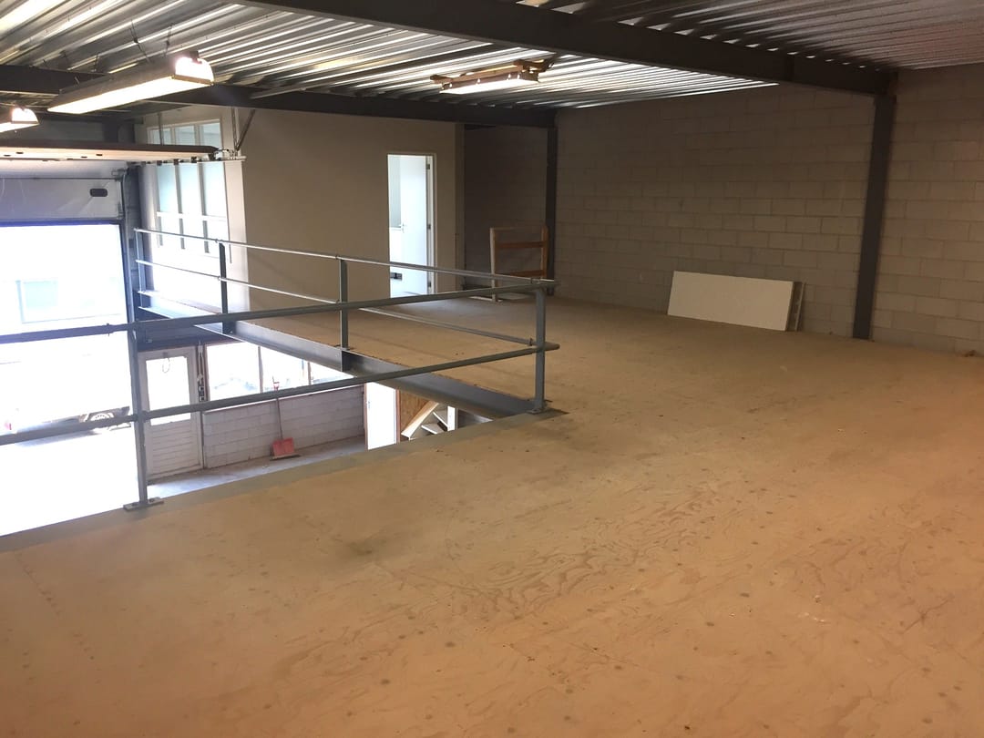 De begane grond is voorzien van een gladde beton vloer, toilet, grote elektrisch bedienbare overheaddeur en separate loopdeur. De eerste verdieping heeft een grote houten verdiepingsvloer en een kantoorruimte met pantry.