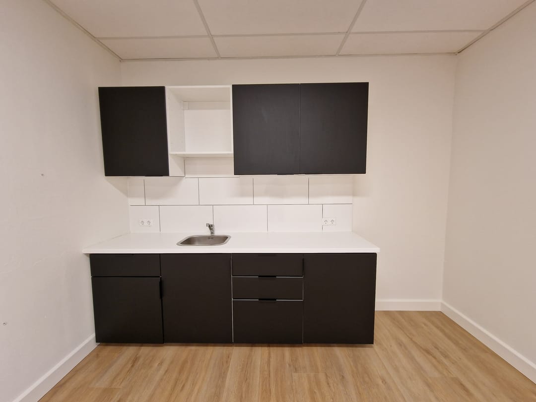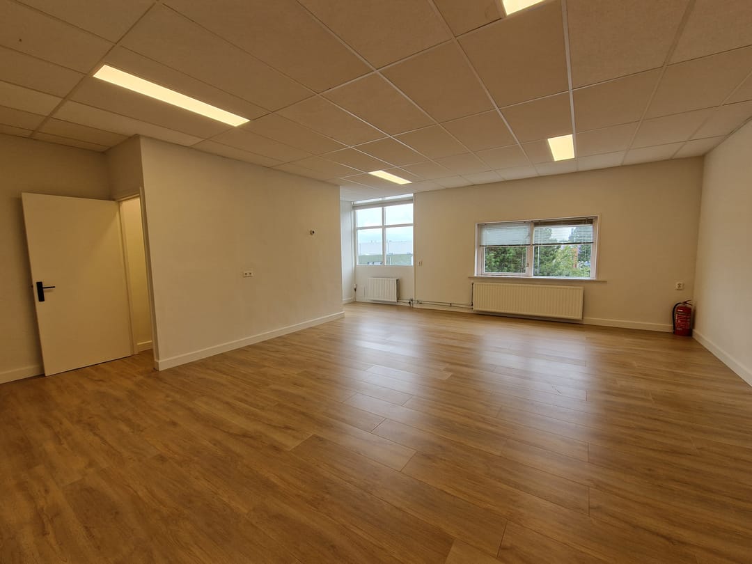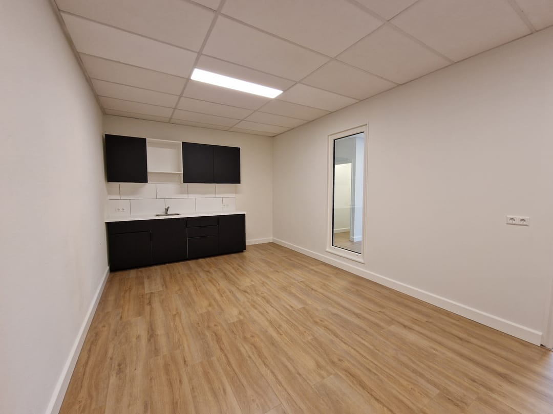 1e verdieping : ruim kantoorvertrek en een kantine / spreekkamer v.v. een keukenblok. Oppervlakte ca. 75 m² BVO.