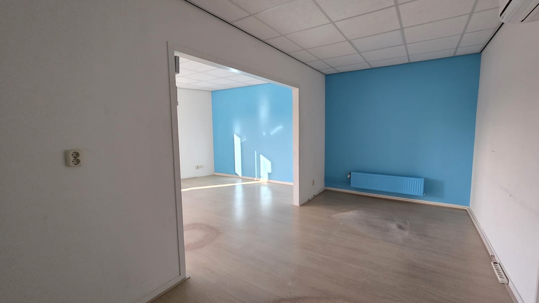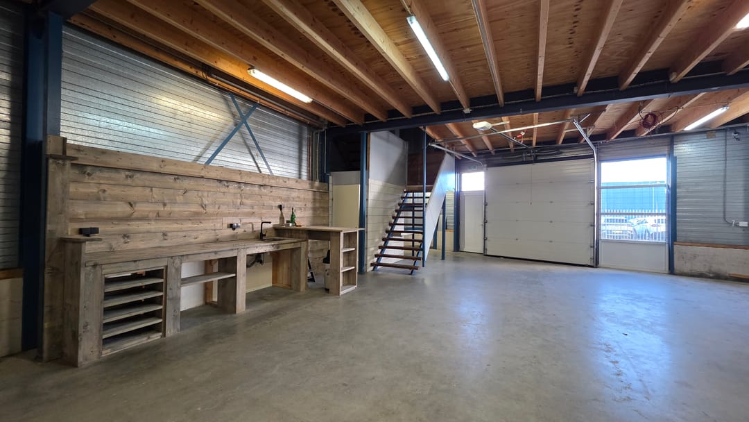 Begane grond: entree, riante bedrijfsruimte voorzien van een nieuwe, elektrisch bedienbaar overheaddeur (3m x 3m), meterkast met 7 groepen tevens krachtstroom, verder nette toiletruimte en een trapopgang naar de 1ste verdieping. De vrije hoogte bedraagt ca. 3,5 m, BVO: ca. 150 m².