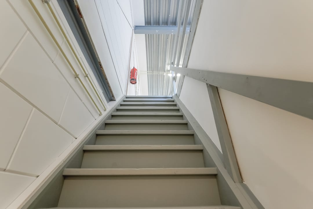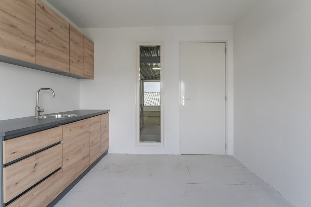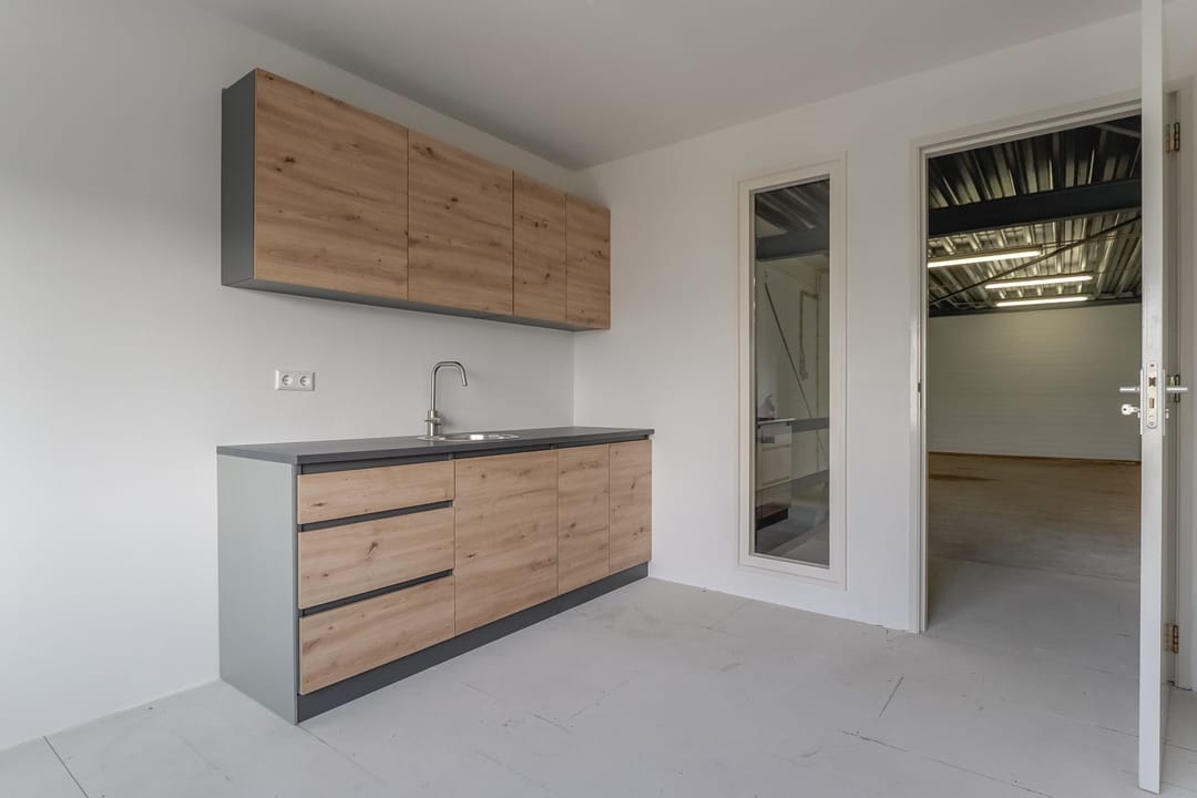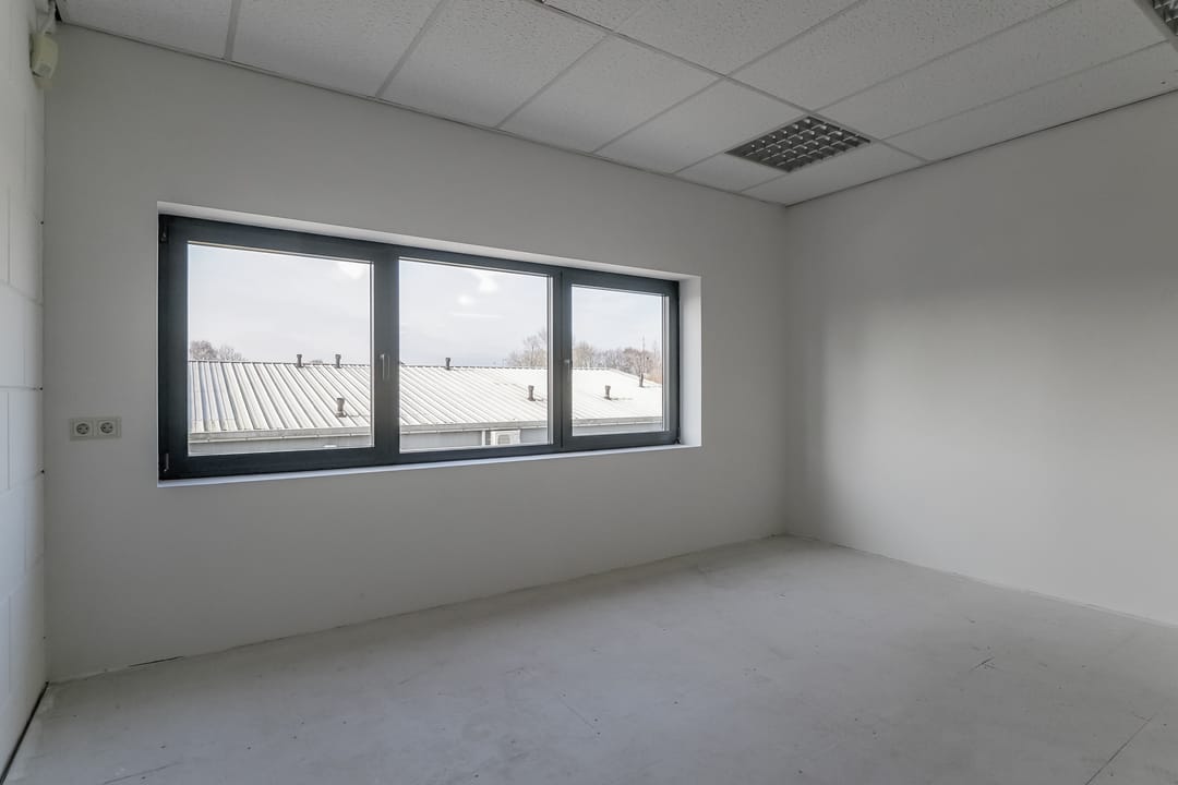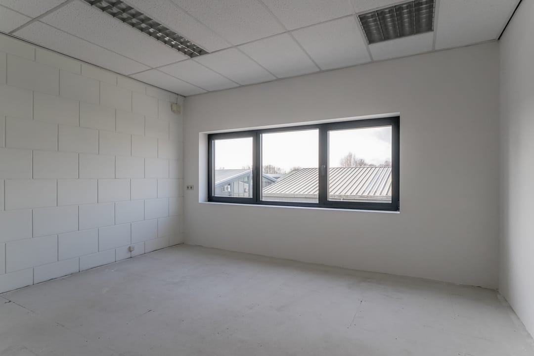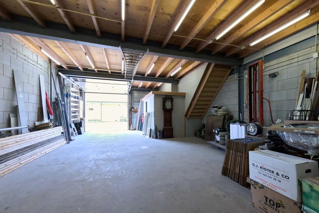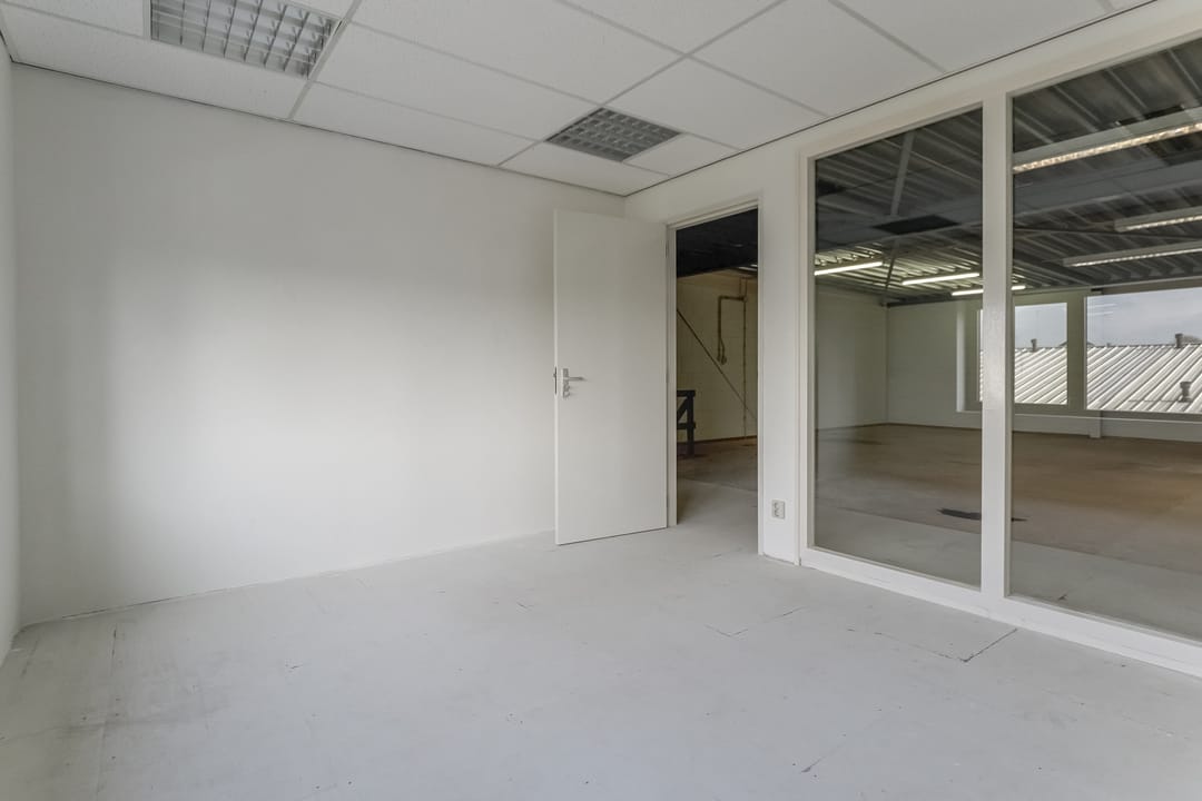 1e verdieping : overloop, kantine en werk-/spreekkamer. Een deel van de bovenverdieping kan nog nader ingericht worden als kantoor, opslag- of werkruimte. Oppervlakte ca. 100 m² BVO.