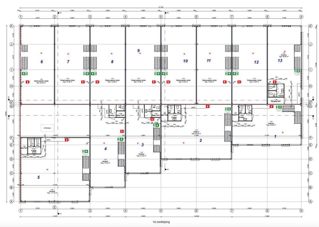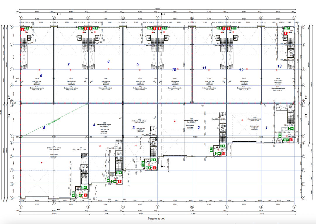 De begane grond is bedrijfsruimte met een vrije hoogte van circa 4,5 meter en heeft een grote elektrische overheaddeur. De 1e verdieping is bedoeld als gebruik ten behoeve van kantoor. Daarnaast is er een separate toegangsdeur met zijlicht waardoor eventuele afsplitsing van de verdieping en begane grond mogelijk is. Unit 7 en 9 worden als casco gebouwd en opgeleverd als twee grote ruimten. De toekomstige eigenaar kan deze dus nog geheel naar eigen wensen en inzicht afbouwen.