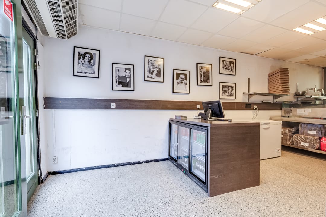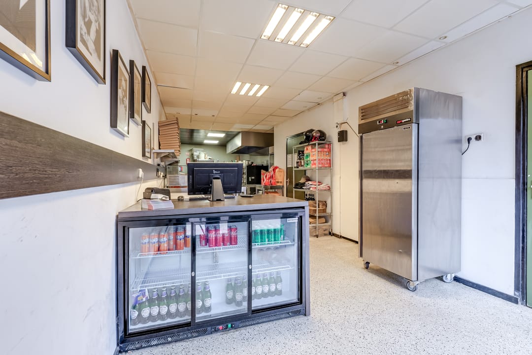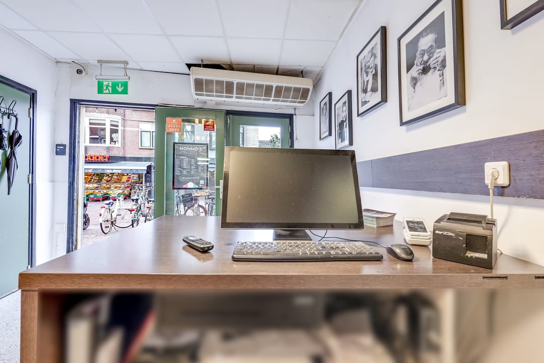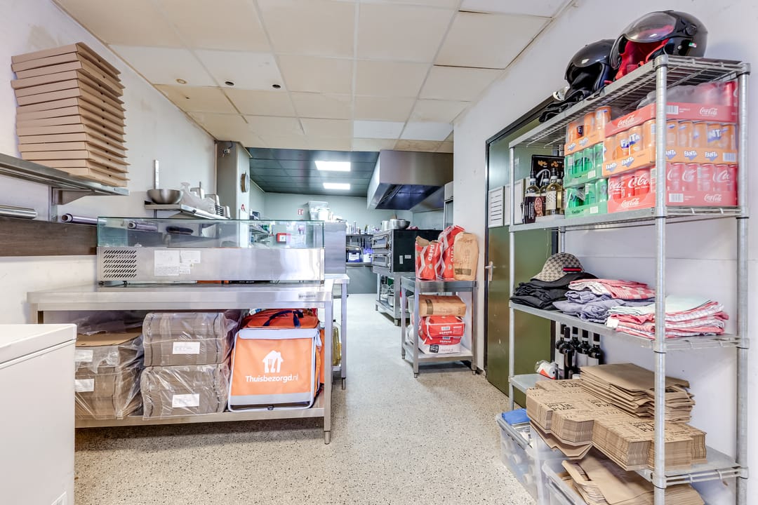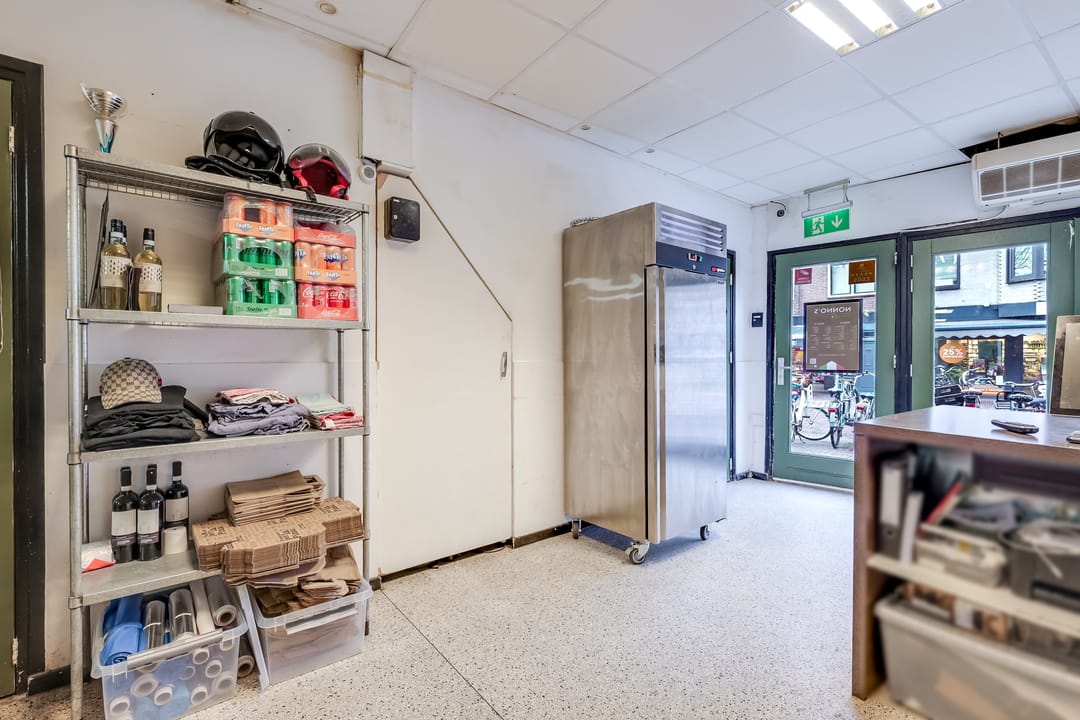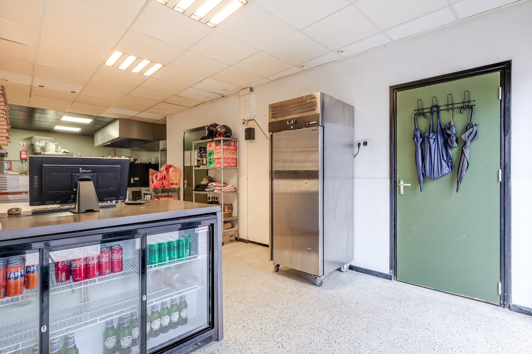 De voorpui bestaat uit een loopdeur en dubbele deuren, die bij mooi weer geopend kunnen worden. Klanten komen binnen in een fraaie en lichte ruimte, met een systeemplafond en inbouwverlichting. Aan de rechterzijde zijn de meterkast, een kast met de HR-ketel en de toiletruimte.