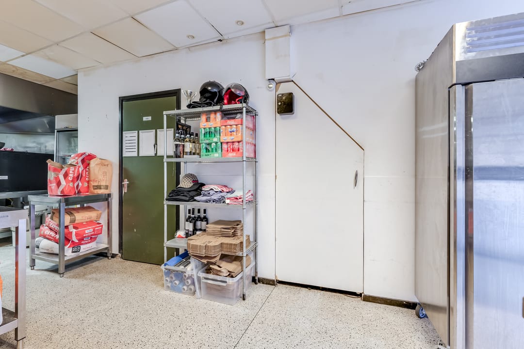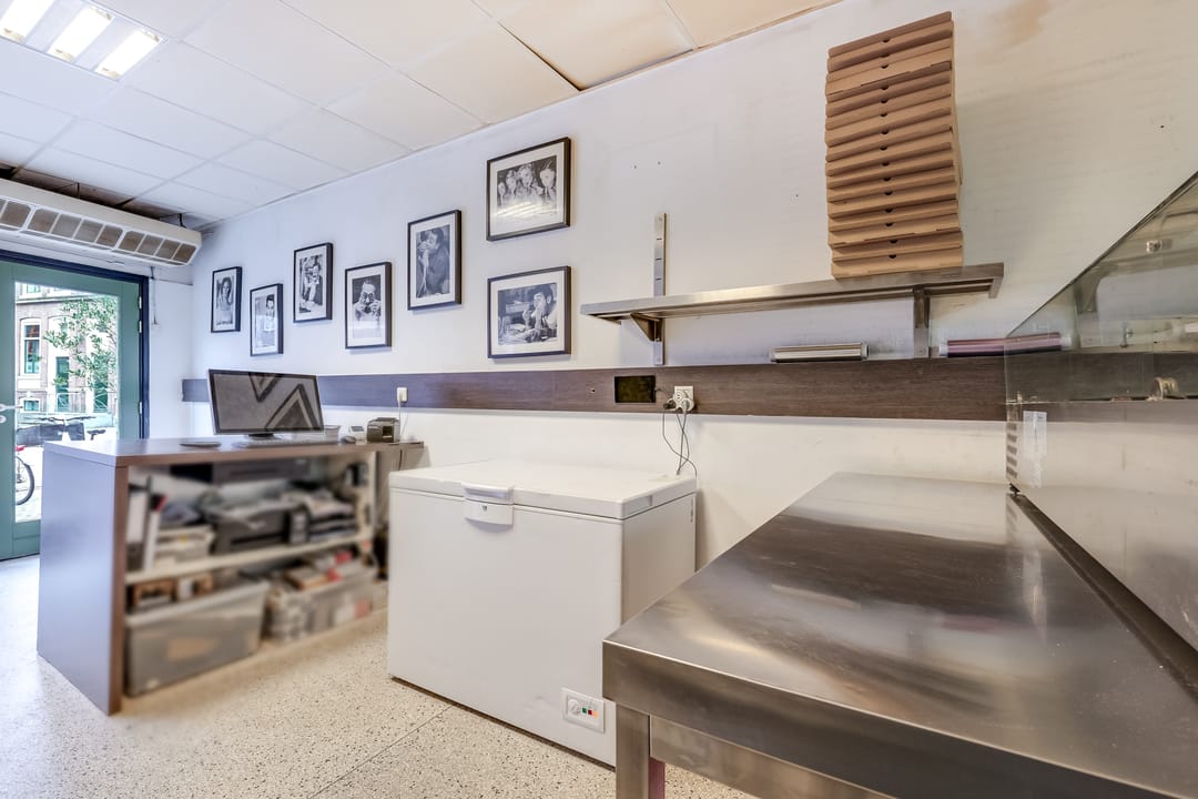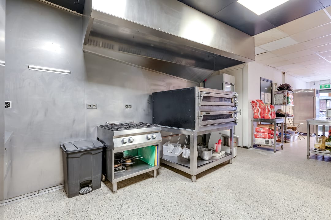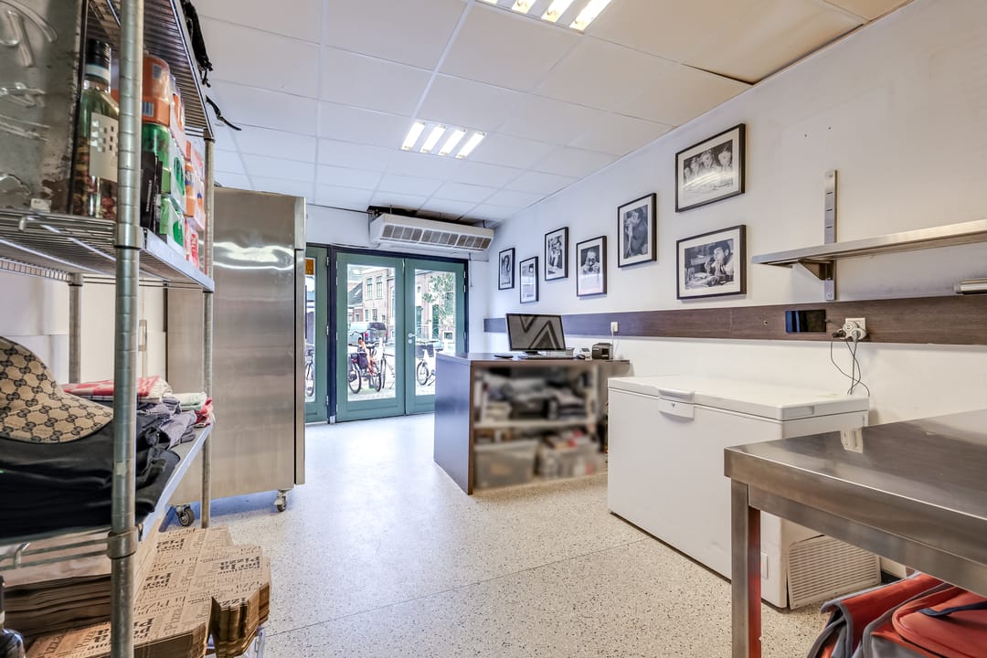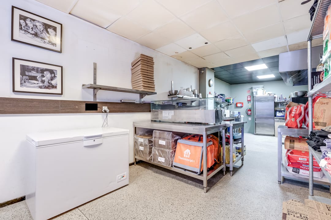 In het achterste deel is de open keuken, die door de huurder is geplaatst. Hier is het systeemplafond in stijlvol zwart uitgevoerd en alle benodigde voorzieningen zijn aanwezig.