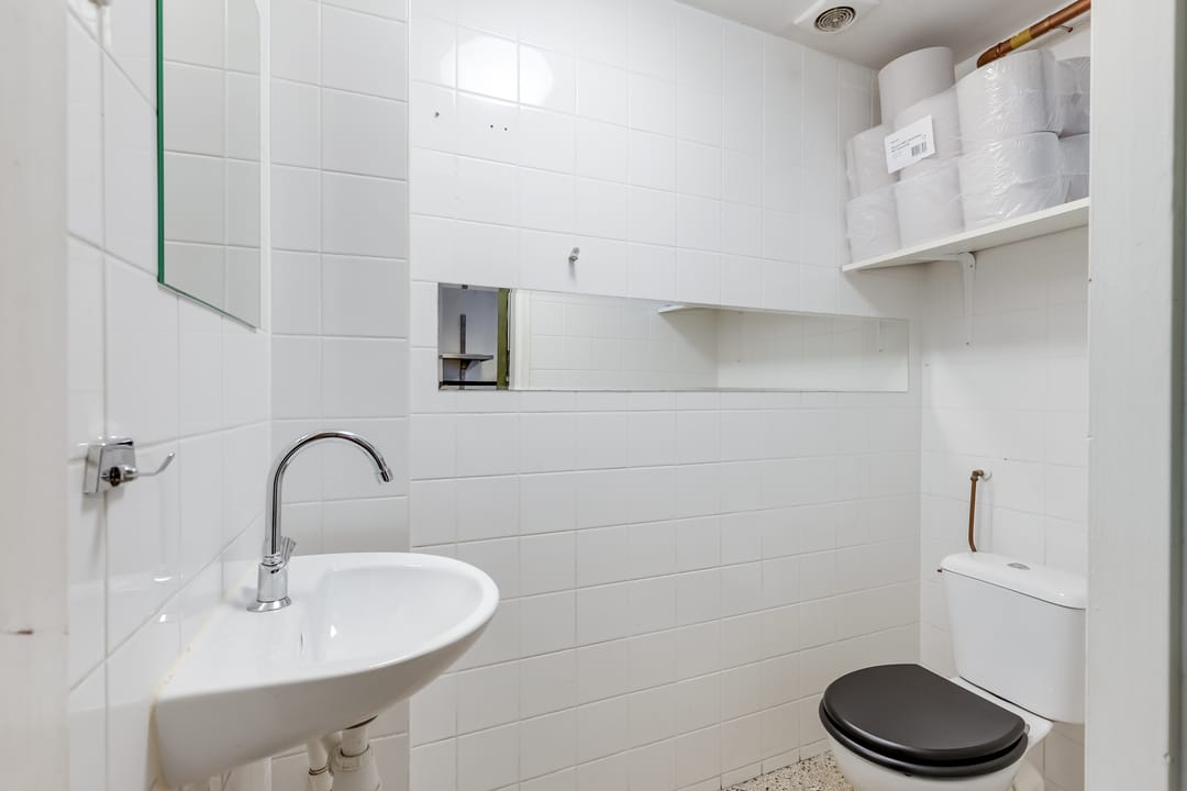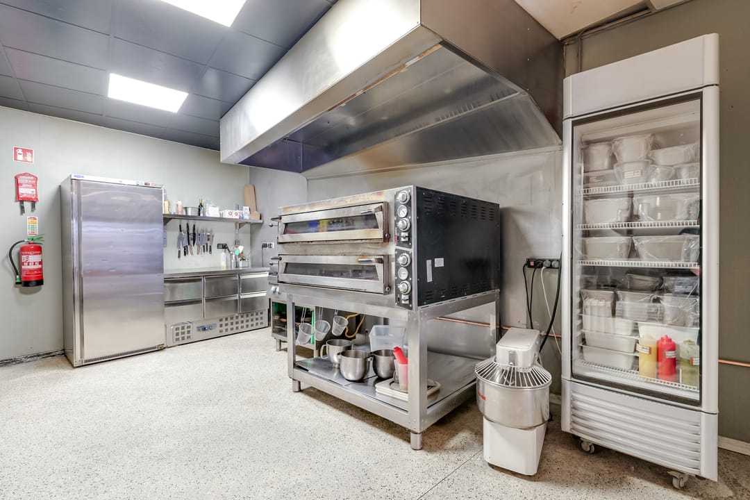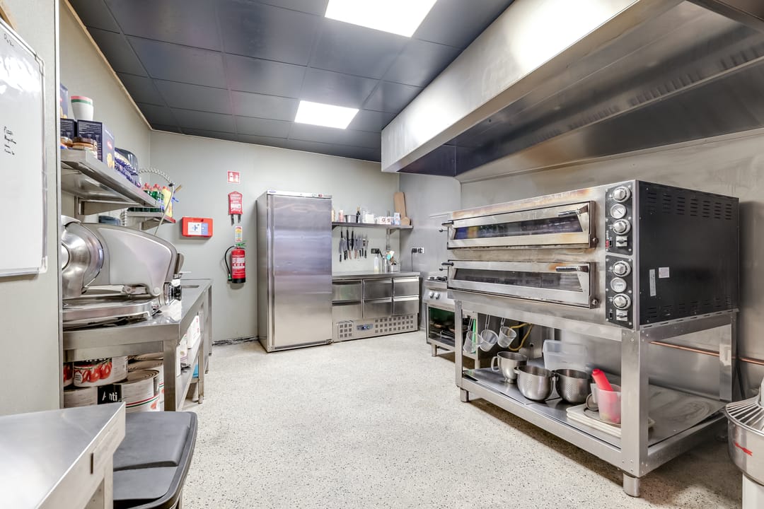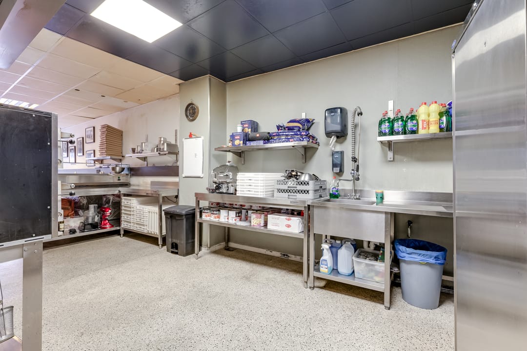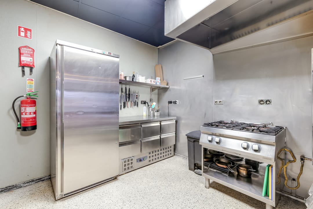 In het achterste deel is de open keuken, die door de huurder is geplaatst. Hier is het systeemplafond in stijlvol zwart uitgevoerd en alle benodigde voorzieningen zijn aanwezig.