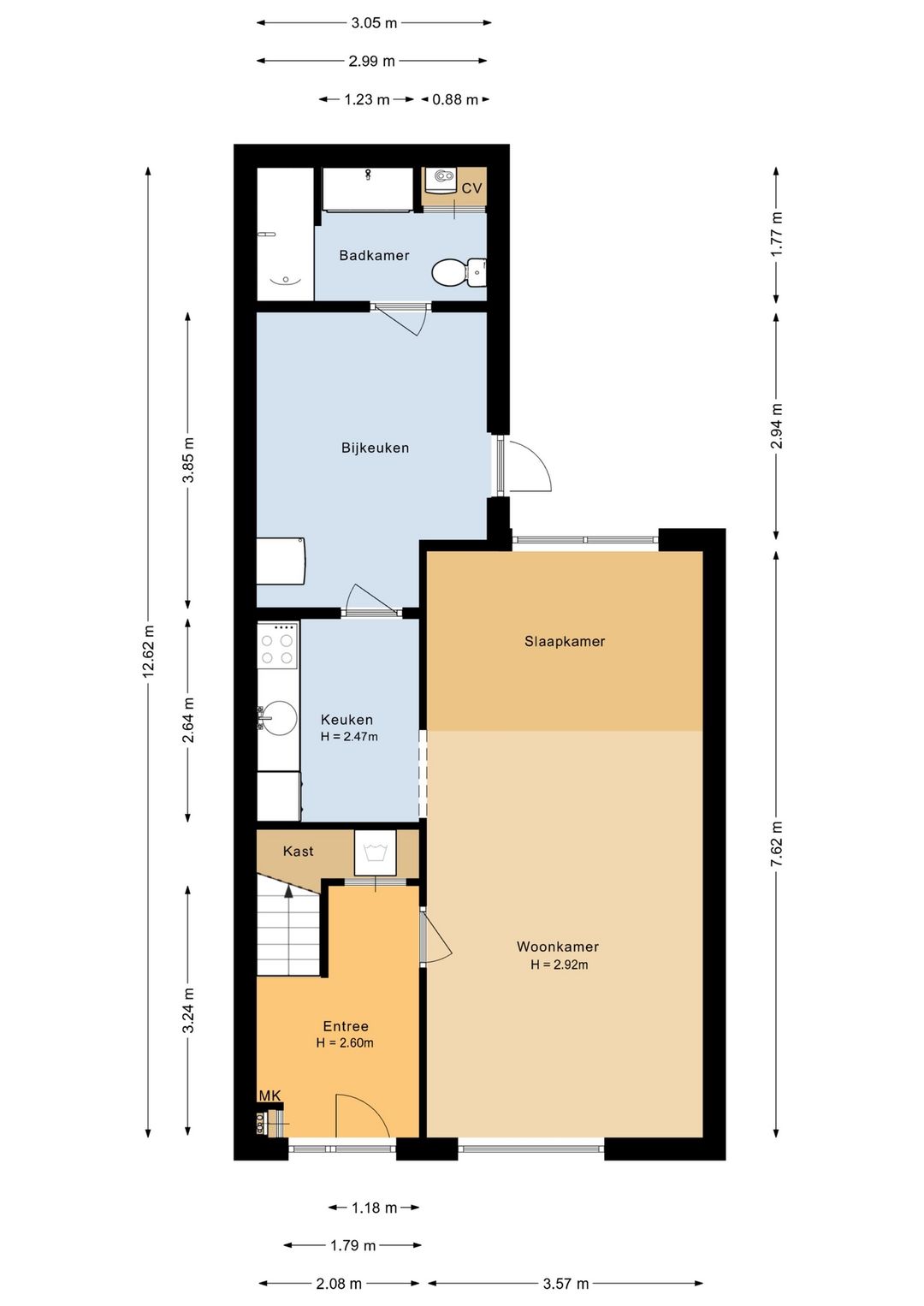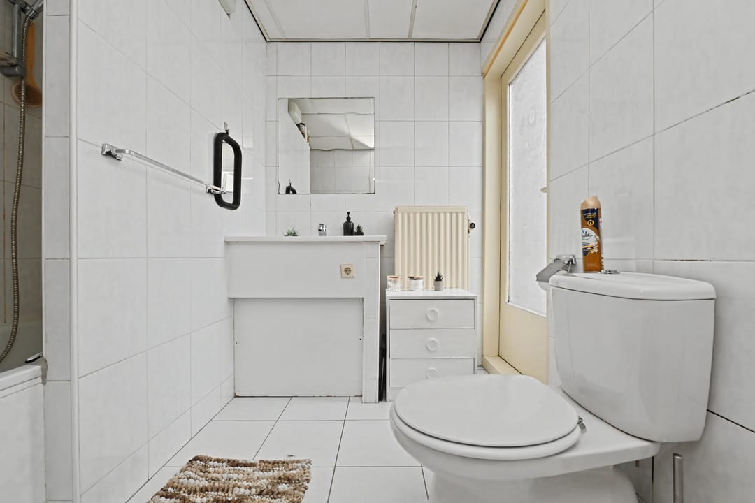 Via de bijkeuken is de tweede badkamer bereikbaar. Deze badkamer is volledig betegeld en voorzien van een gestuct plafond met mechanische ventilatie. De ruimte beschikt over een bad-/douchecombinatie. Tevens bevindt zich hier een kast met toegang tot de cv-ketel. Deze extra badkamer op de begane grond biedt veel comfort en flexibiliteit in gebruik.