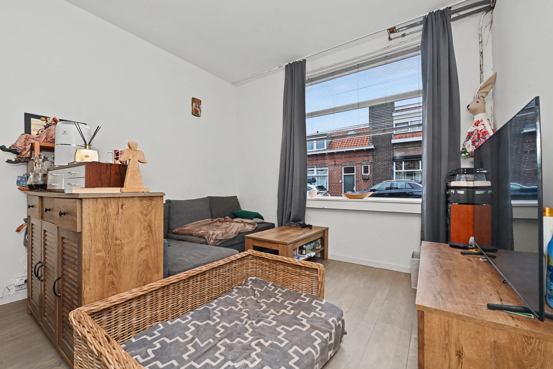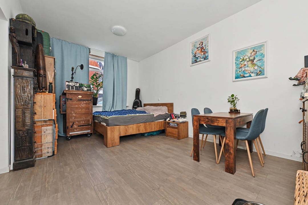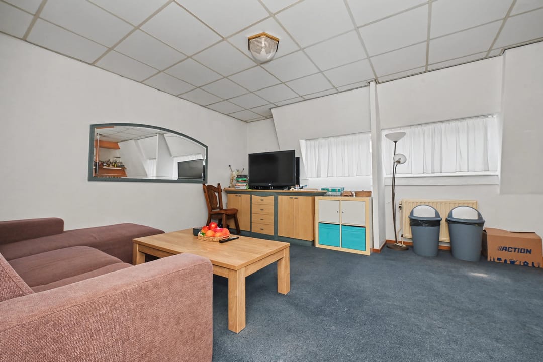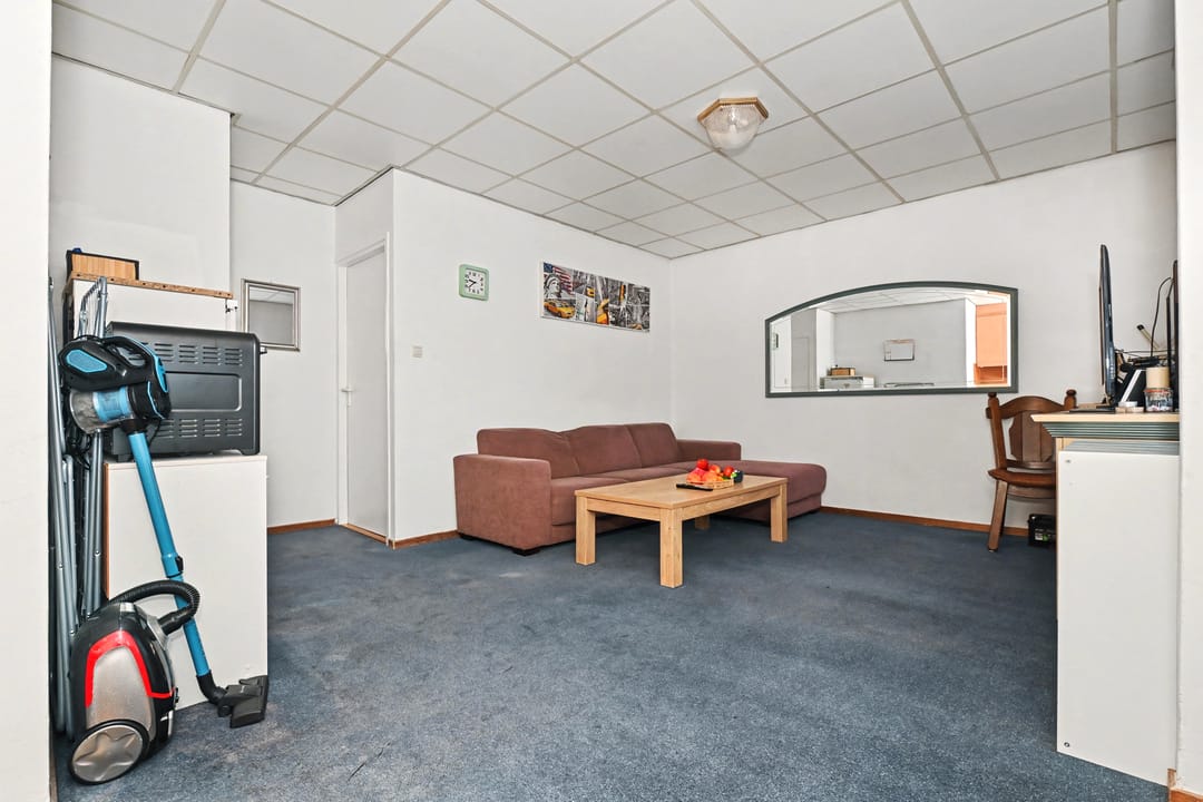 De woonkamer is afgewerkt met een laminaatvloer en gestucte wanden en plafond. De ruimte is praktisch ingedeeld en beschikt over een ruime eethoek, waardoor er voldoende ruimte is voor een eettafel en eventueel een slaapgedeelte. Dankzij de prettige lichtinval voelt de woonkamer aangenaam en open aan.
