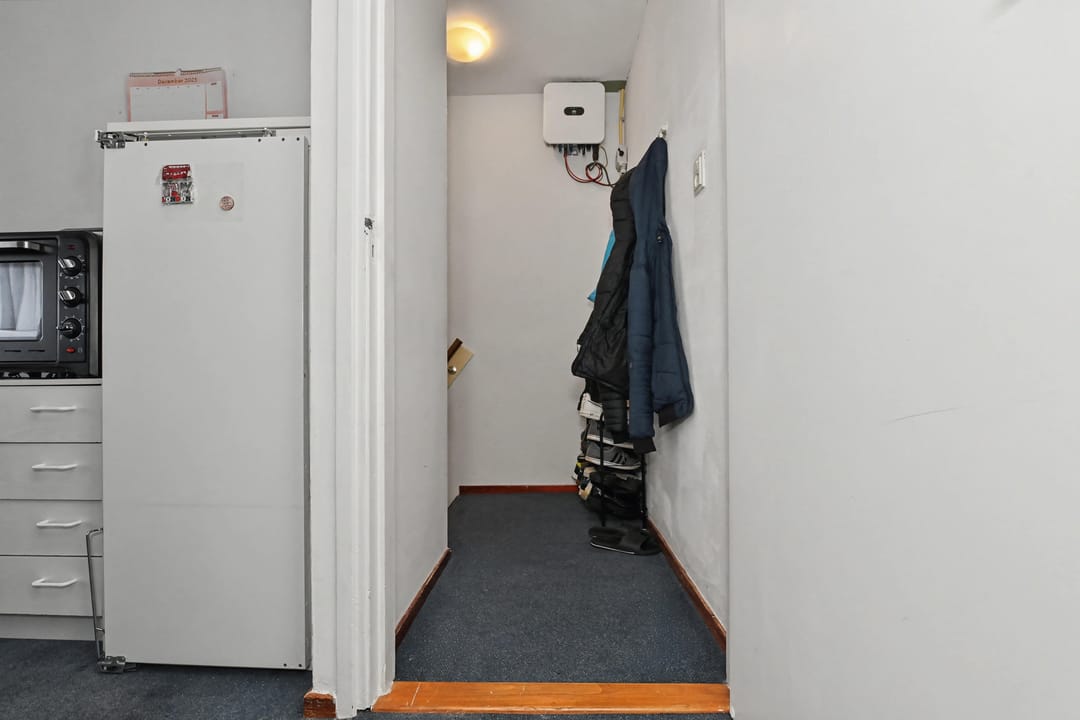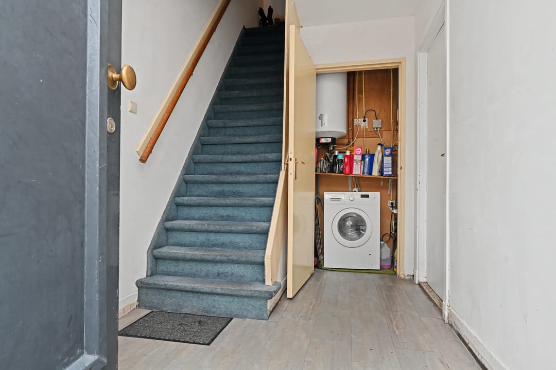 De entreehal is voorzien van een laminaatvloer en gestucte wanden en plafond, Vanuit de hal is er toegang tot de trap naar de zelfstandige bovenverdieping, de meterkast heeft 9 groepen 2 aardlekken, de opstelplaats van de boiler en de wasmachine, evenals de toegang tot de benedenwoning.