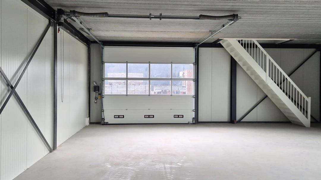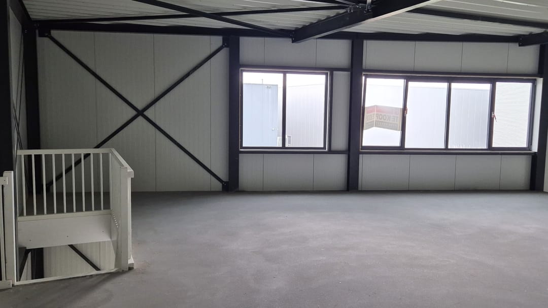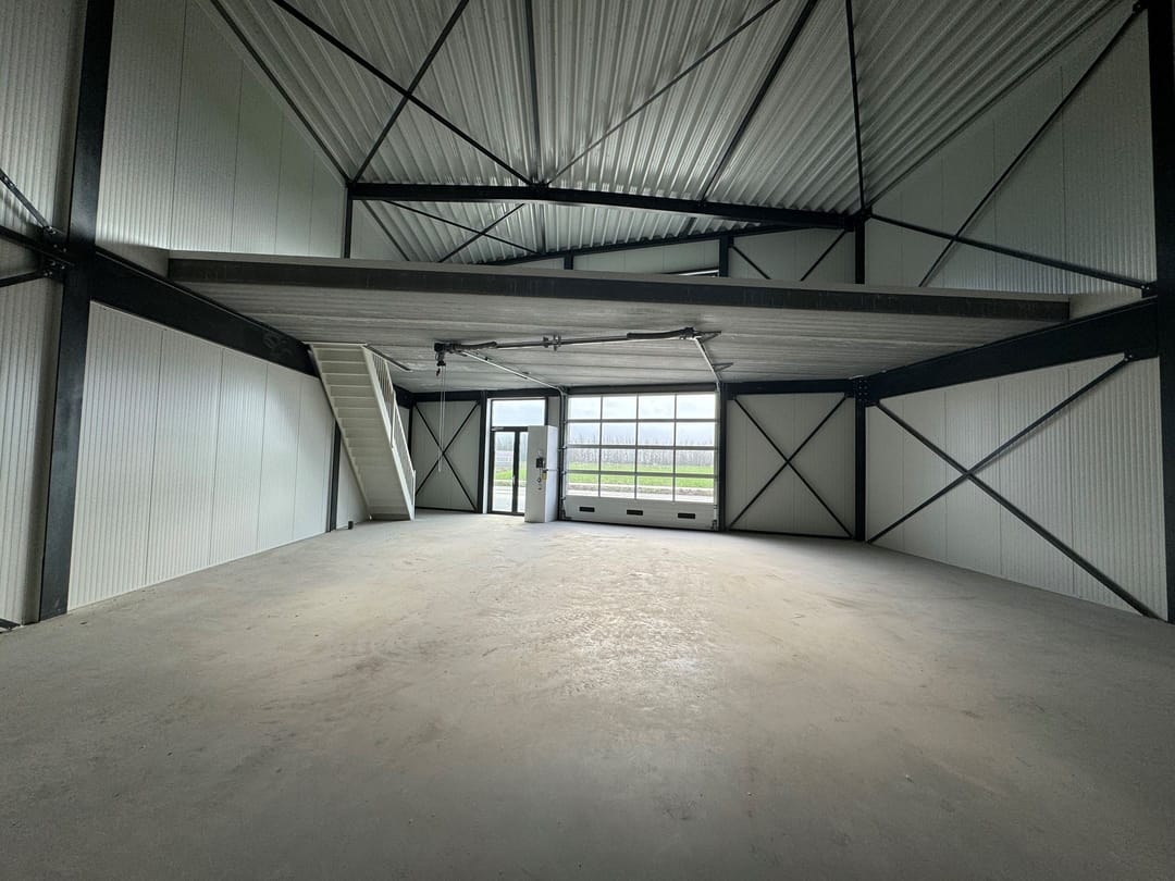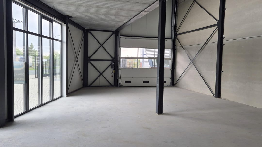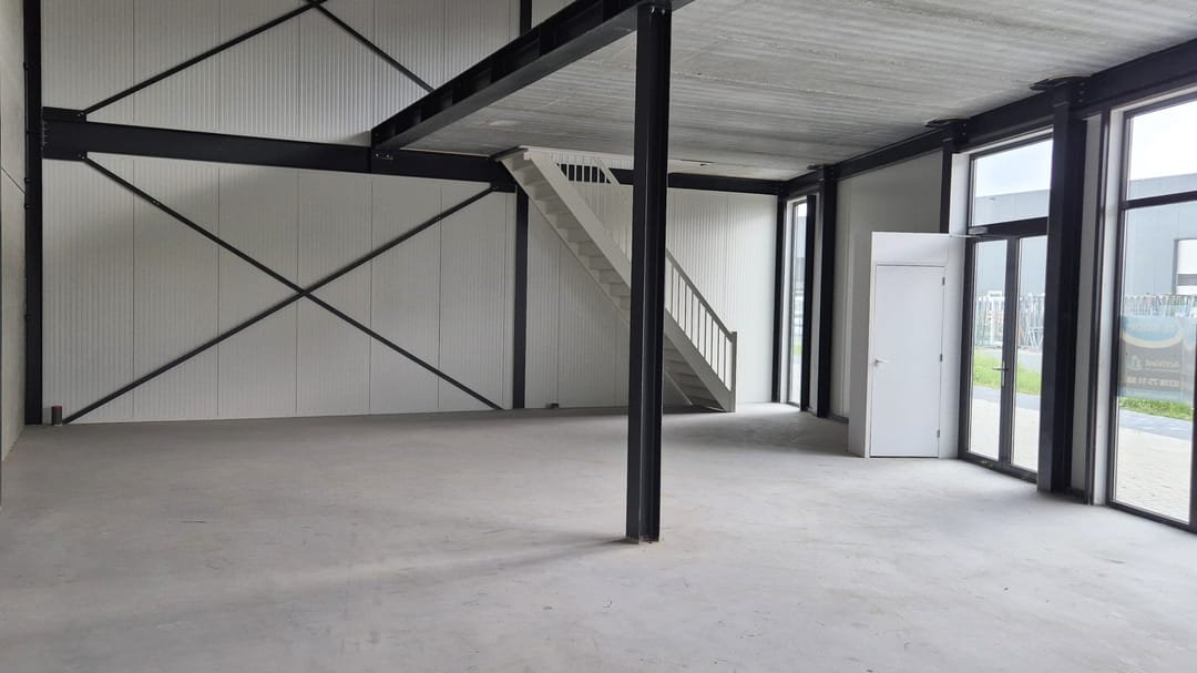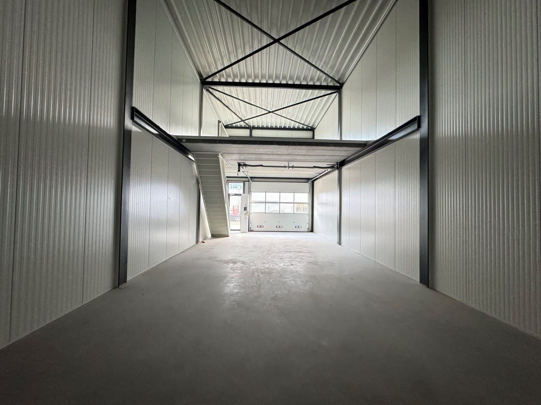 De begane grond bestaat uit een ruime bedrijfshal met elektrisch bedienbare roldeur en zelfsluitende glazen deur en een trapopgang naar 1e verdieping.