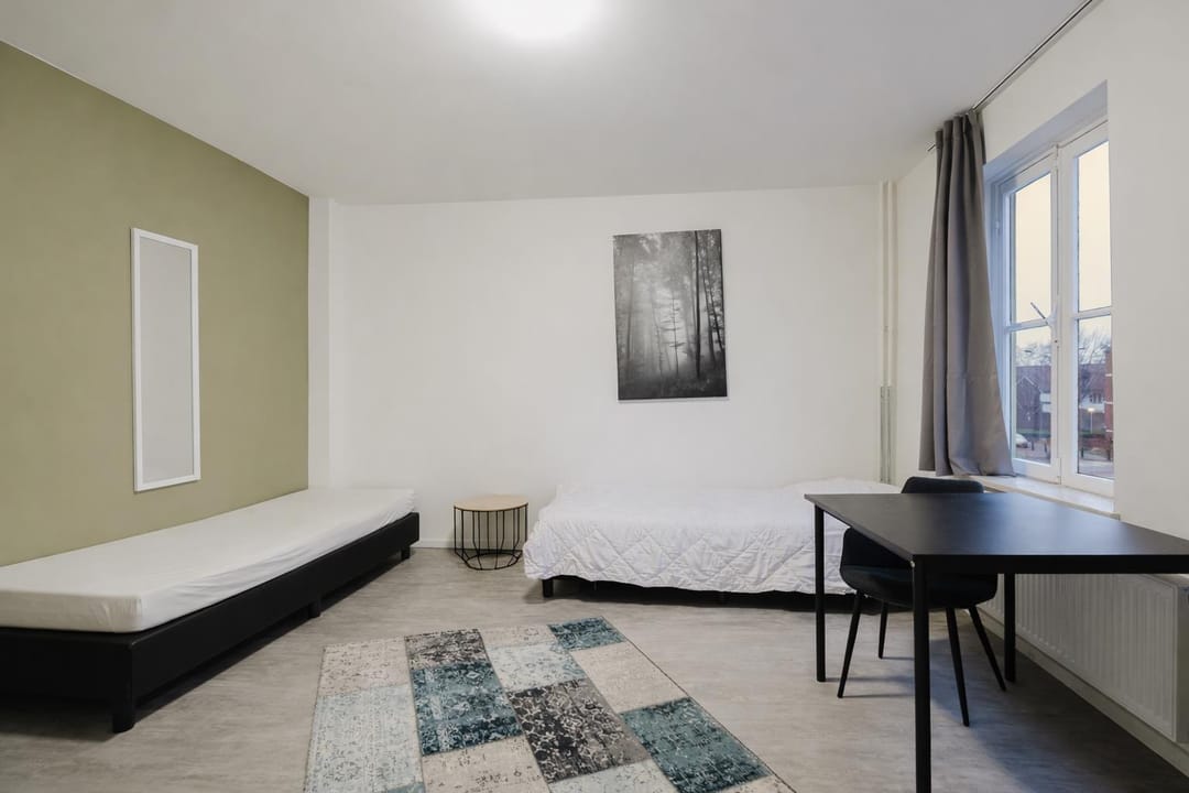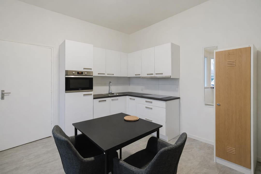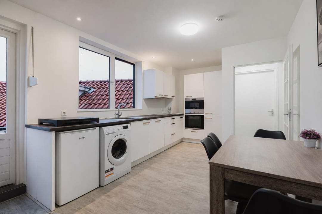 De eerste verdieping bestaat uit een grote gemeenschappelijke keuken, badkamer met douche, wastafel en toilet, toegang naar het dakterras en drie afzonderlijke woonvertrekken.