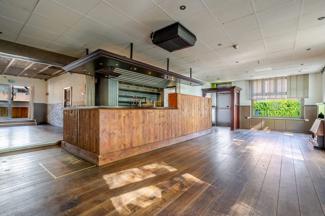 De begane grond omhelst een uitgestrekte horecaruimte met bargedeelte met aansluitend een multifunctionele zaal. Verder zijn op de begane grond de toiletgroepen, kantoor, keuken, spoelkeuken en opgang naar boven gelegen.