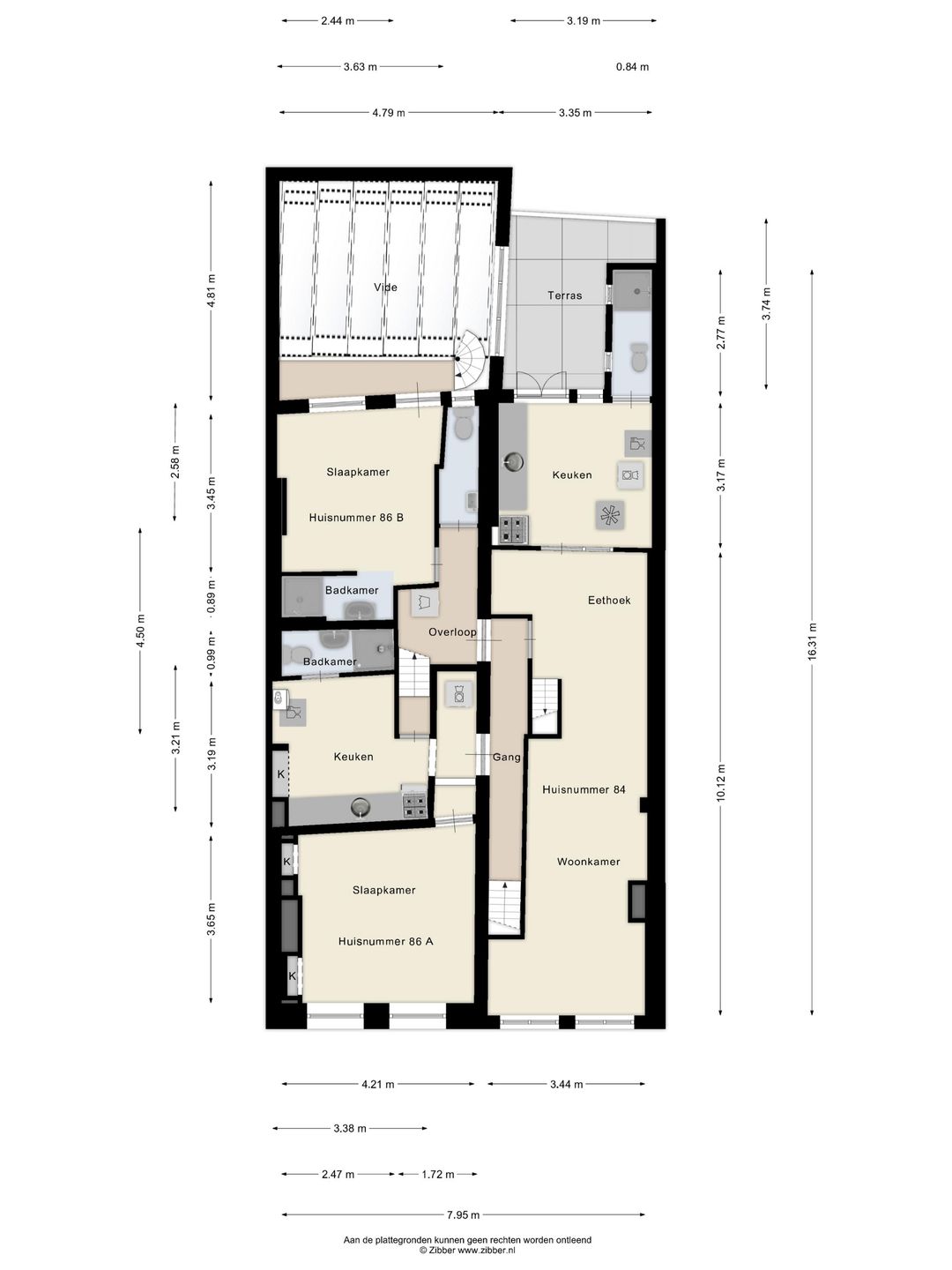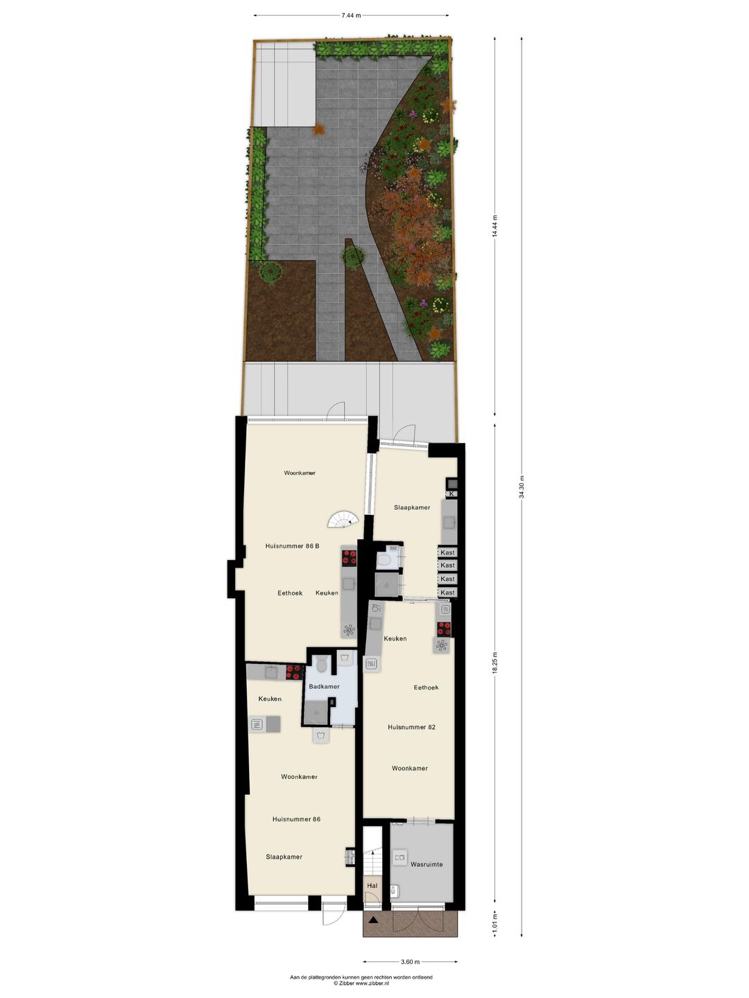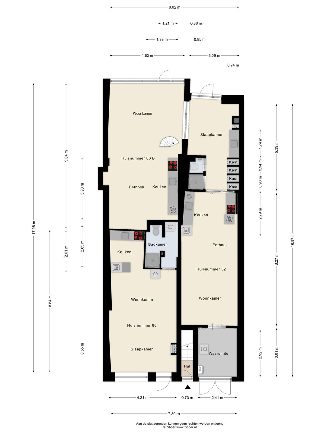 nr. 86B (2 woonlagen): Entree via de achtertuin bereikbaar middels een achterom. Open concept woonkamer-woonkeuken. Opvallend en indrukwekkend tegelijkertijd is de hoeveelheid licht die deze ruimte betreedt, de hoge vide geeft een zeer ruimtelijk gevoel. Met trap bereikbare overloop, vanaf hier bereik je de slaapkamer met badkamer. Het toilet is apart. Dan is er nog ruimte waar plek is voor de wasmachine, tevens is de gemeenschappelijke hal bereikbaar met toegang aan de voorzijde van het pand.