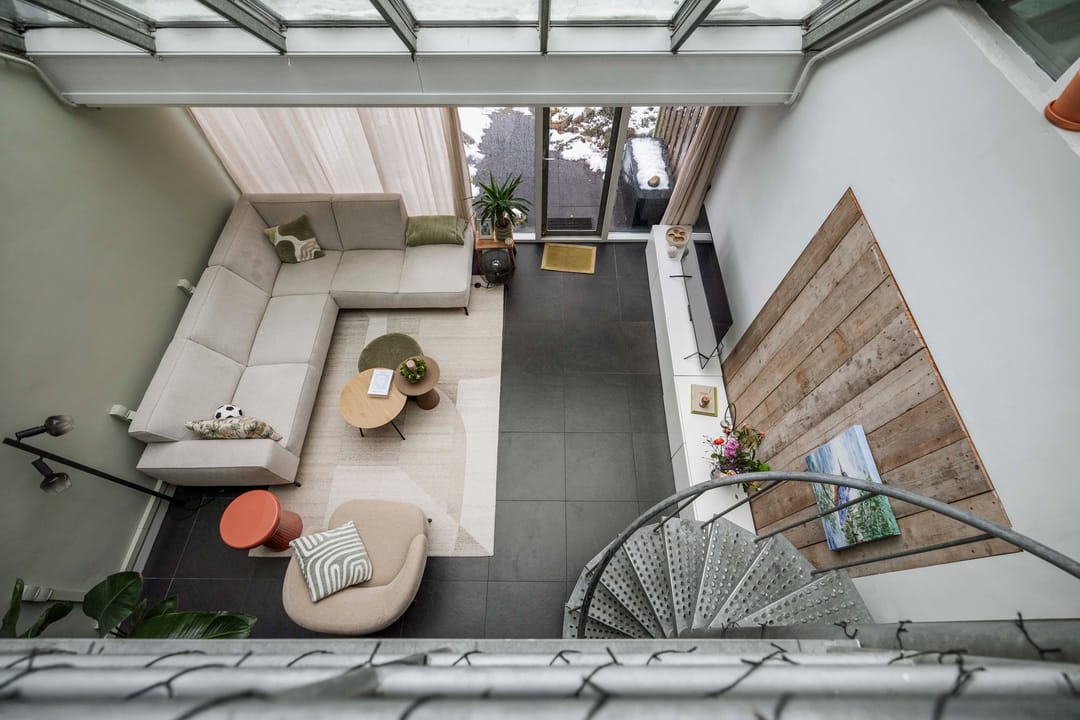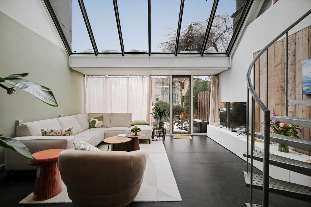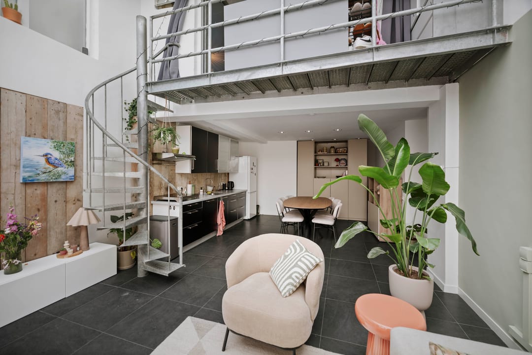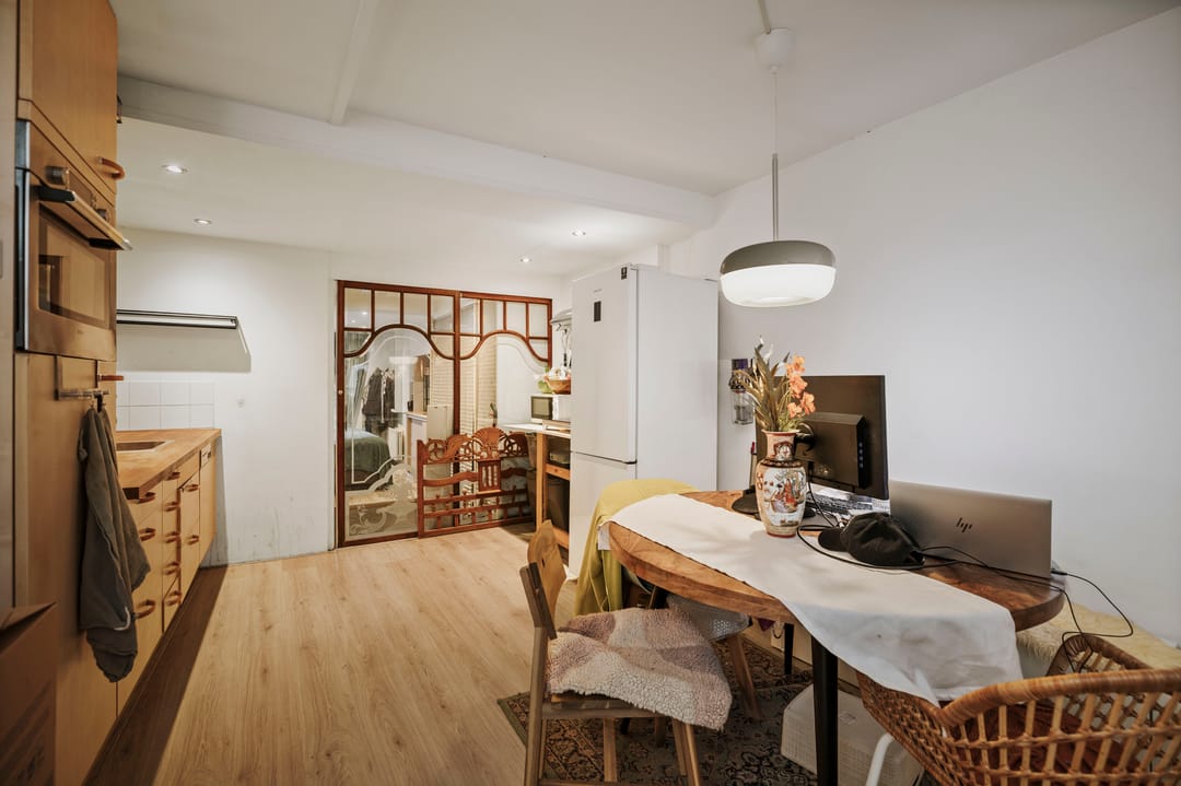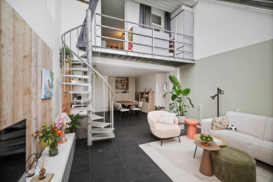 nr. 86B (2 woonlagen): Entree via de achtertuin bereikbaar middels een achterom. Open concept woonkamer-woonkeuken. Opvallend en indrukwekkend tegelijkertijd is de hoeveelheid licht die deze ruimte betreedt, de hoge vide geeft een zeer ruimtelijk gevoel. Met trap bereikbare overloop, vanaf hier bereik je de slaapkamer met badkamer. Het toilet is apart. Dan is er nog ruimte waar plek is voor de wasmachine, tevens is de gemeenschappelijke hal bereikbaar met toegang aan de voorzijde van het pand.
