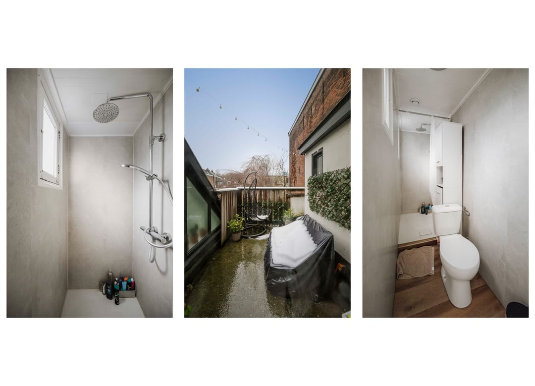 nr. 84 (2 woonlagen): eigen entree aan voorzijde, per trap bereikbare gezamenlijke overloop. Entree naar woonkamer aan de voorzijde met twee raampartijen. Middels tussendeur bereikbare keuken, keukenopstelling met los gaskooktoestel met oven, de keuken bevindt zich aan de achterzijde. Aangrenzend is een doucheruimte met toilet. Tevens kan je vanuit de keuken op je eigen balkon stappen. Via een trap in de woonkamer bereik je de (met luik dicht te zetten) zolderverdieping waar 2 slaapvertrekken met raam zich aan de voorzijde en achterzijde bevinden. Hier zijn tevens dakramen aanwezig.