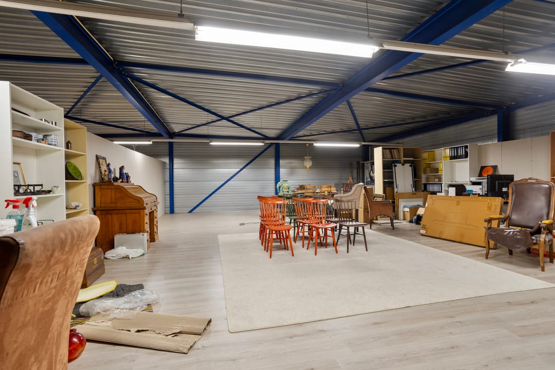 Opgetrokken in staalconstructie, gemetselde borstwering, geïsoleerde damwandprofielplaten, betonnen vloeren. Bitumineus dak is in 2020 is vervangen (met garantie).