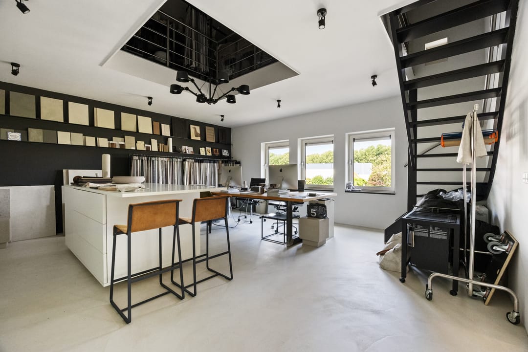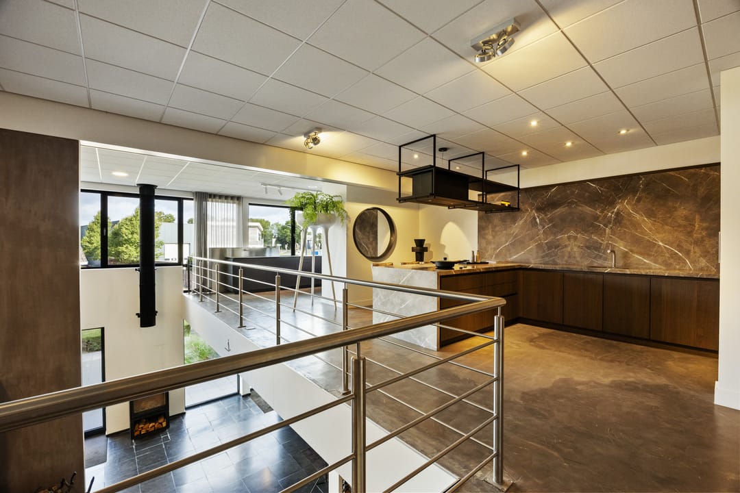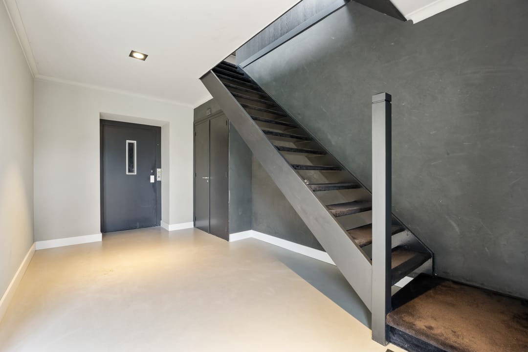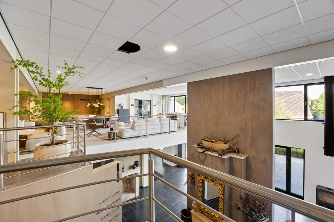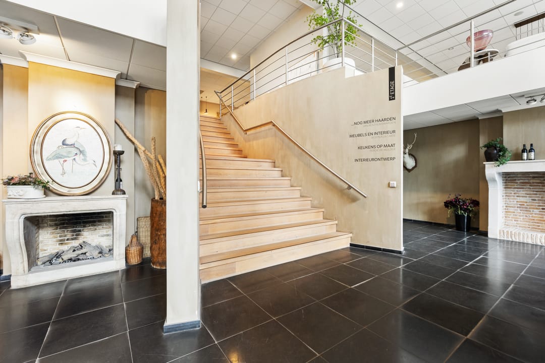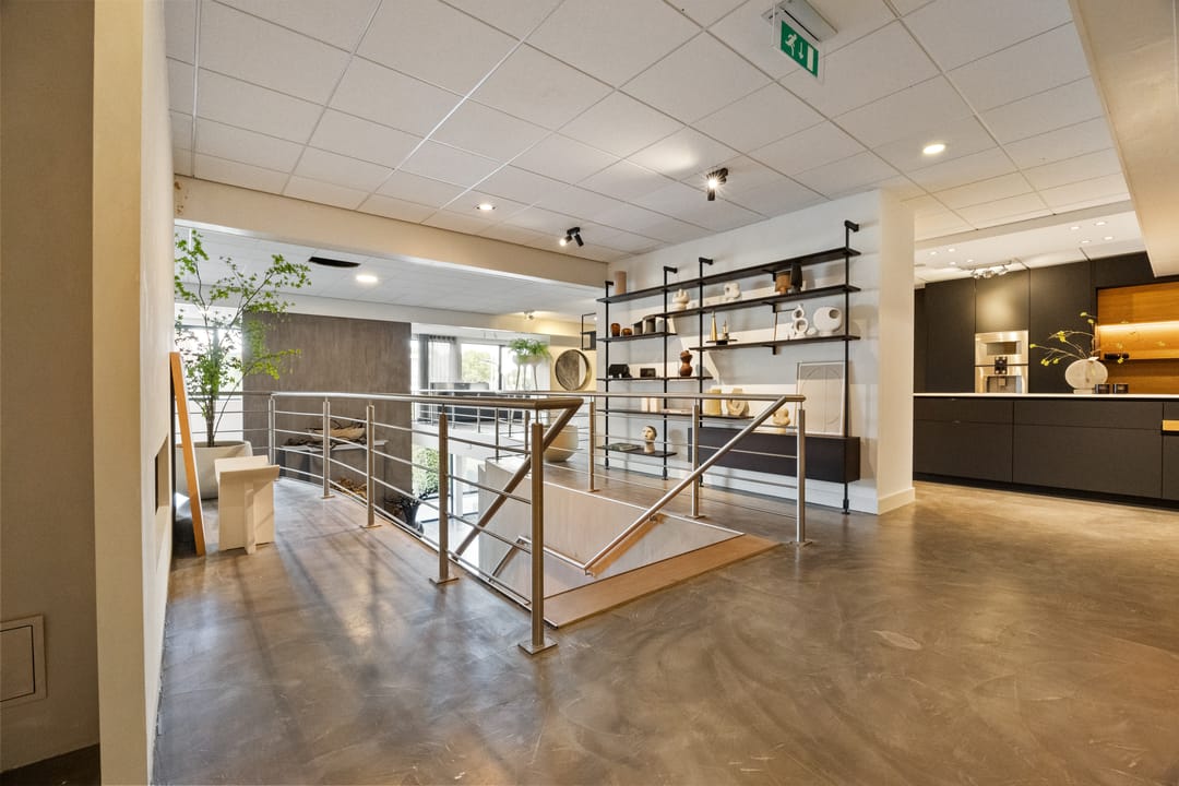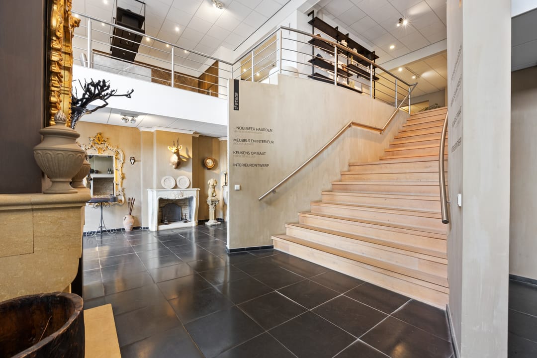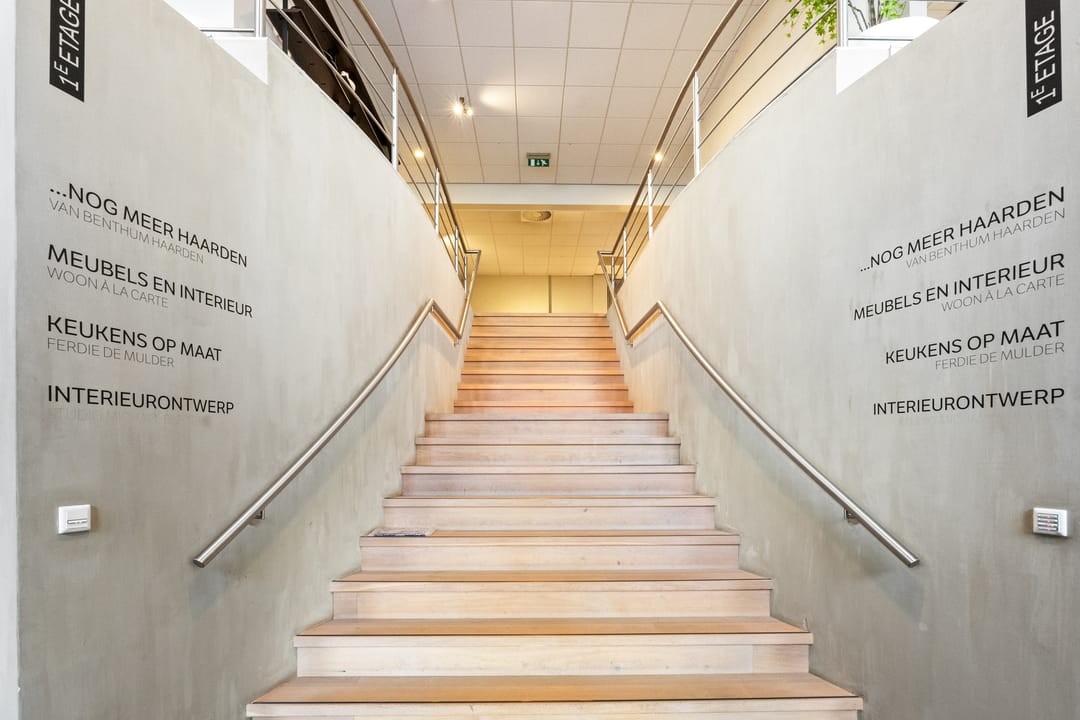 middels vaste trap en liftinstallatie bereikbaar showroom en stalenkamer.