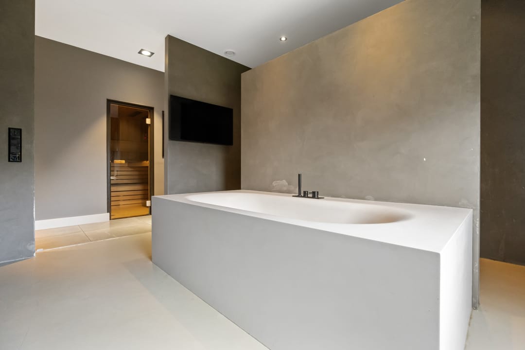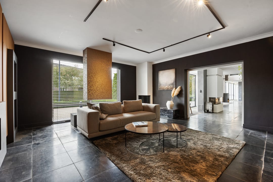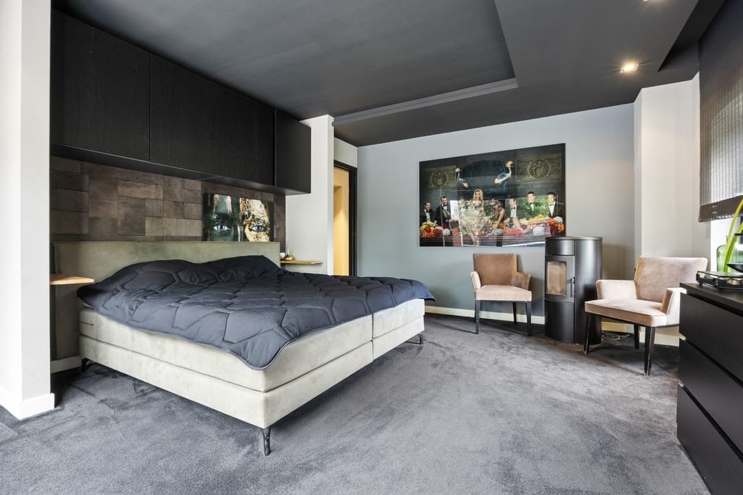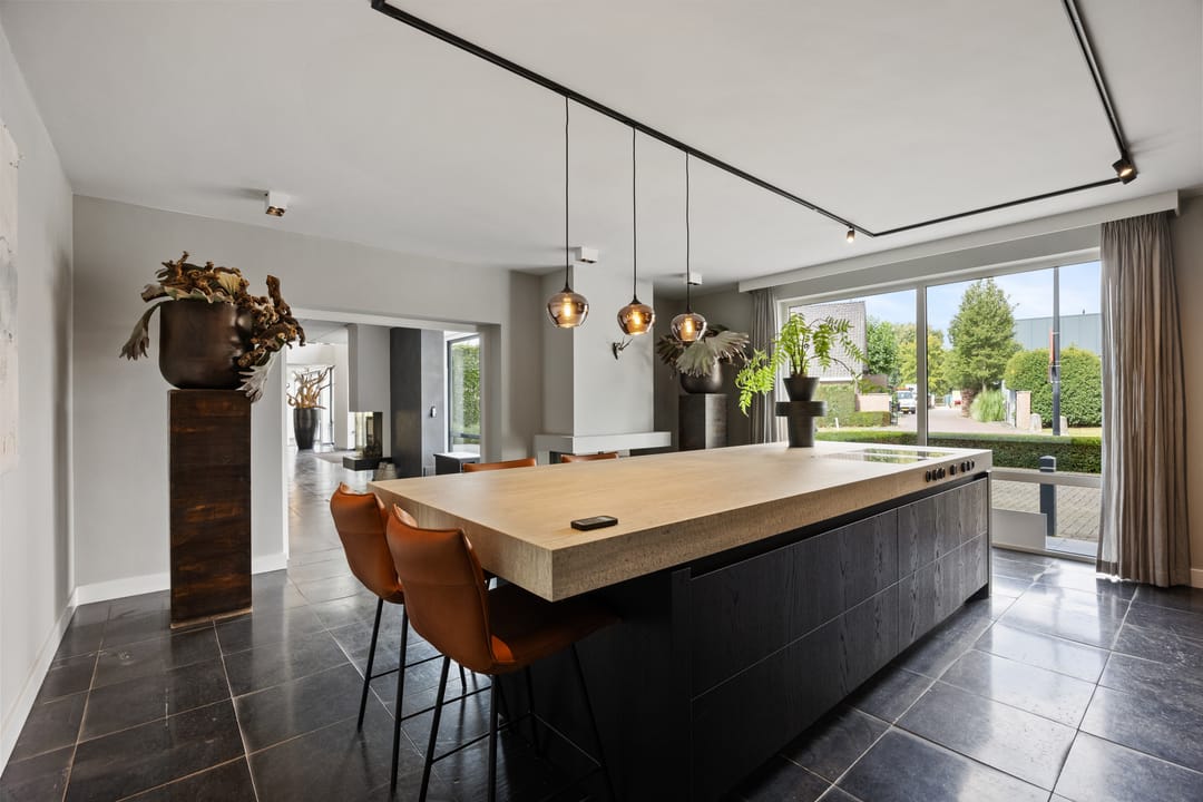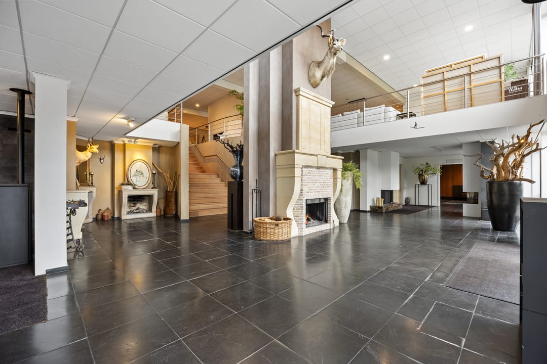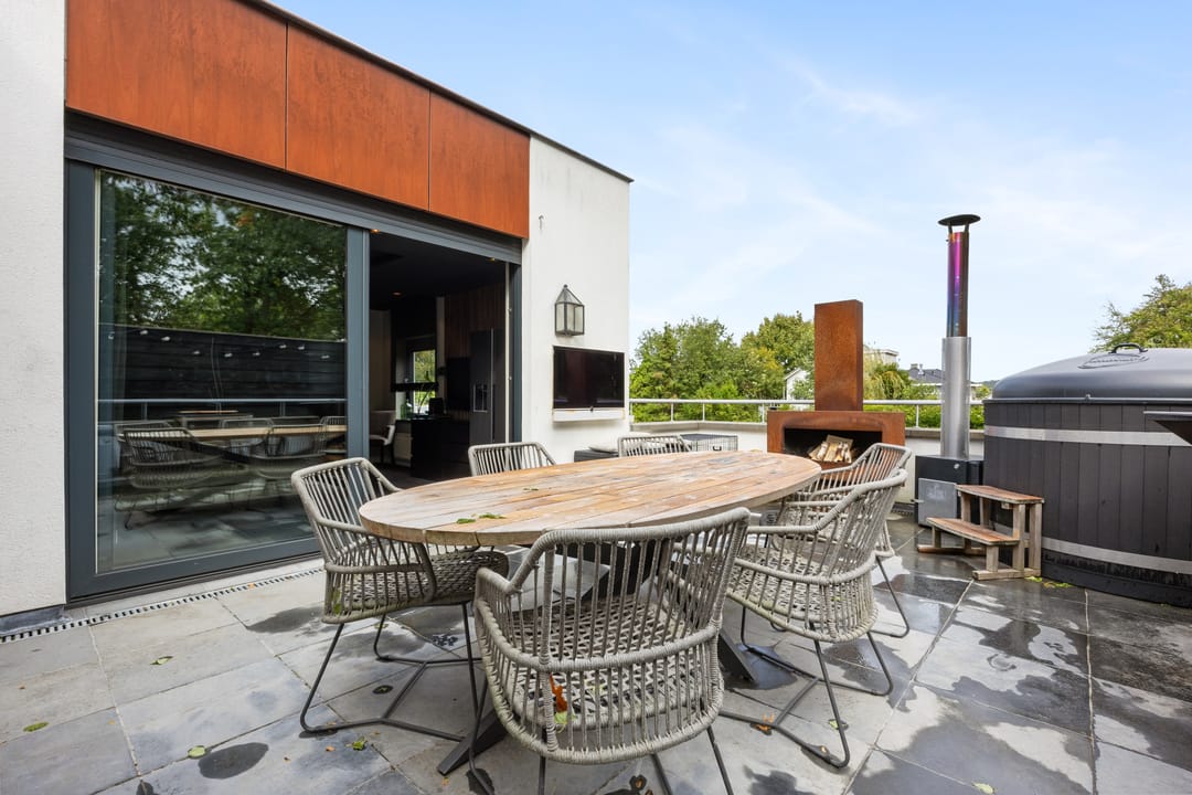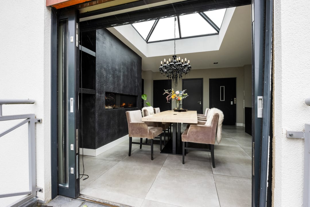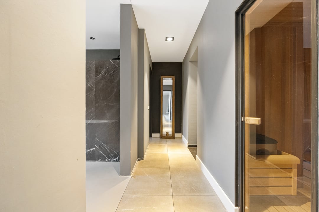 - overloop met glazen dak, balkon, toilet met vaste wastafel, urinoir en closet (zeer luxe), lift, leefkeuken met fraaie keukeninrichting met apparatuur en bergruimte, living met prachtige kasten op maat gemaakt, gang, badkamer met closet, ligbad, wastafelmeubel en inloopdouche (luxe), sauna, bergruimte, vier slaapkamers en riant terras;