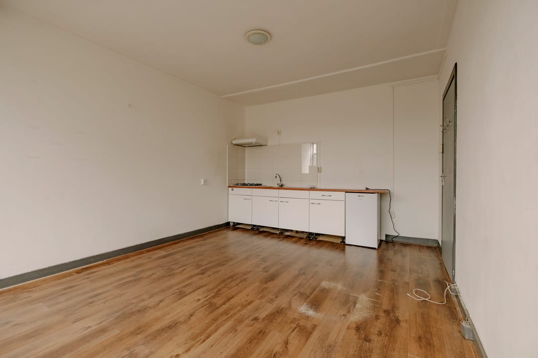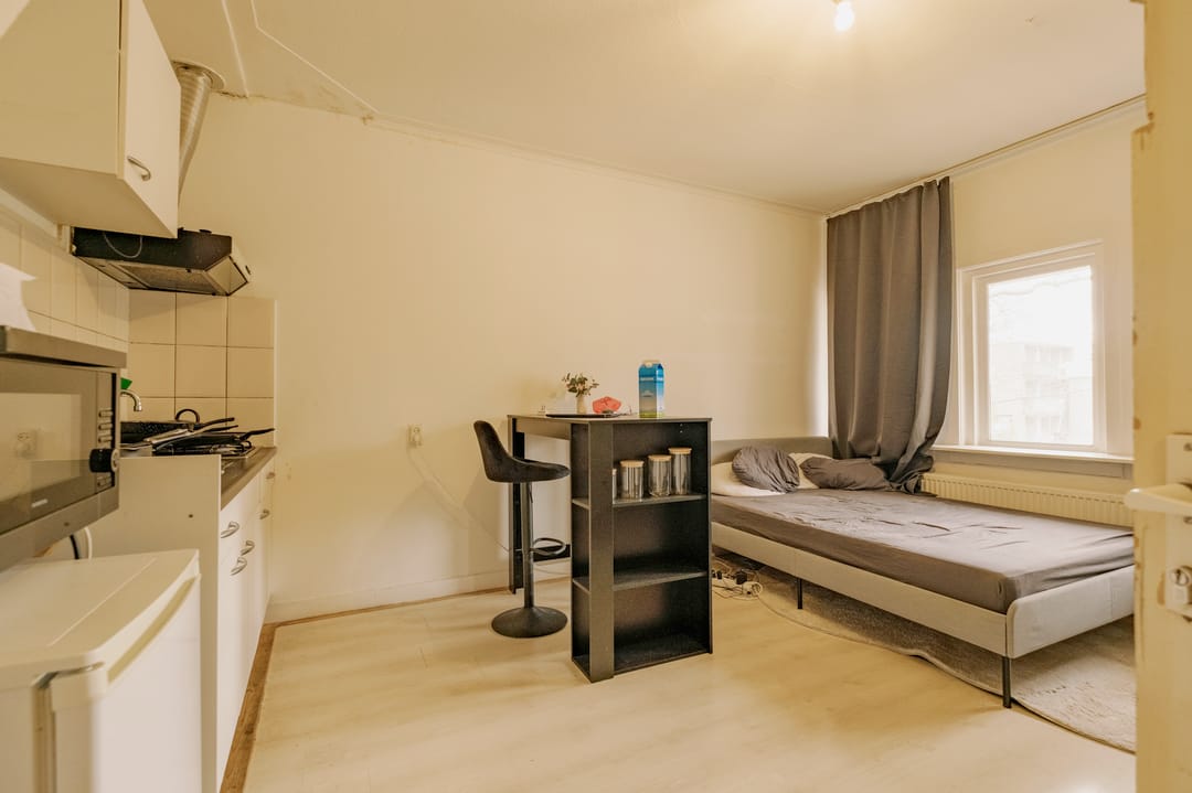 De begane grond beschikt over een vestibule en een gang. Aan de voorzijde bevindt zich een ruime kamer met een eigen, oorspronkelijke buitendeur. Aan de achterzijde is een ruime kamer gesitueerd met directe toegang tot de op het zuidwesten gelegen terrastuin. Via de wasruimte is de voormalige schuur bereikbaar, thans in gebruik als derde kamer. Alle drie de kamers zijn voorzien van een eenvoudige keukenopstelling. In de gang bevindt zich de badkamer, uitgerust met een toilet.