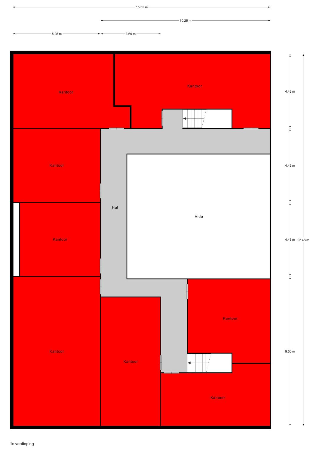Het object is middels drie entrees aan de voorzijde toegankelijk. Via de hoofdentree bereikt u de hal met een vide op de eerste verdieping. Via één van de twee houten trappen wordt de 1e verdieping bereikt waar verschillende kantoorruimtes aanwezig zijn.
