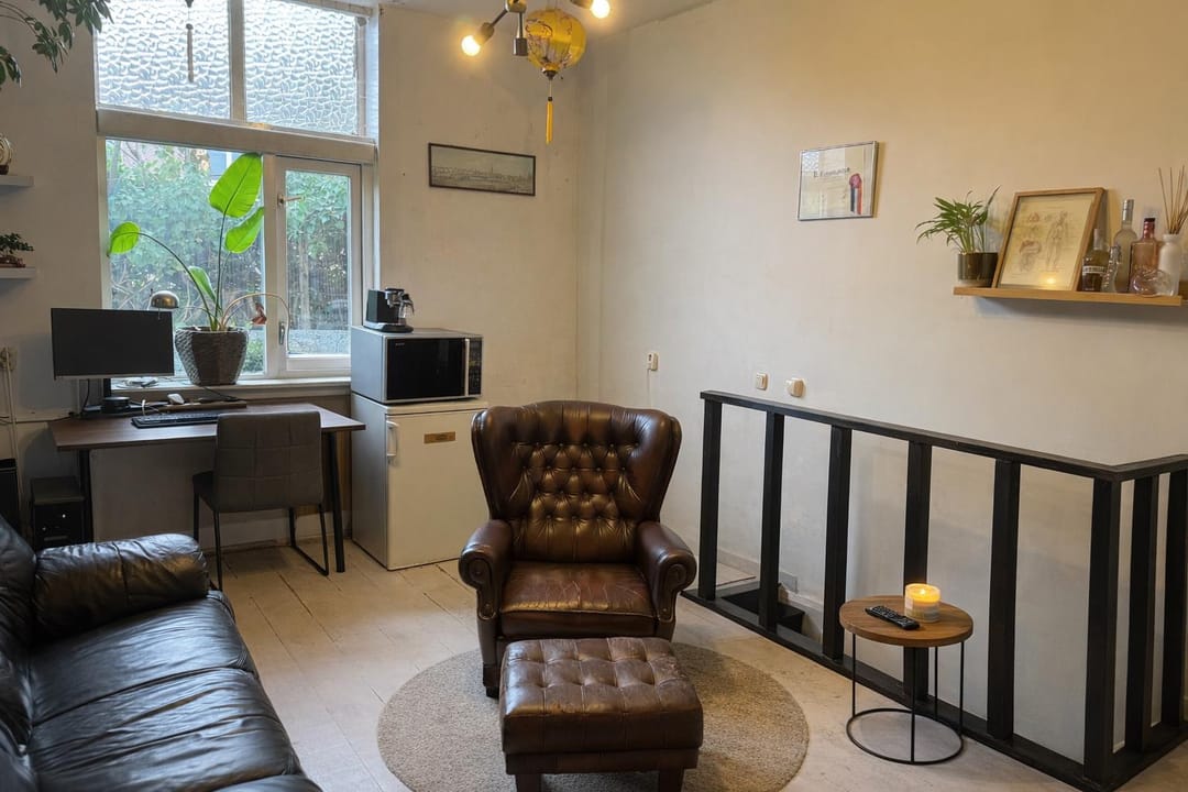 - Studio 1: sfeervolle woonkamer met keukenblokje, toilet, wastafel en douche (ca. 23 m2). Trap naar het souterrain met slaapkamer en wasmachine aansluiting;