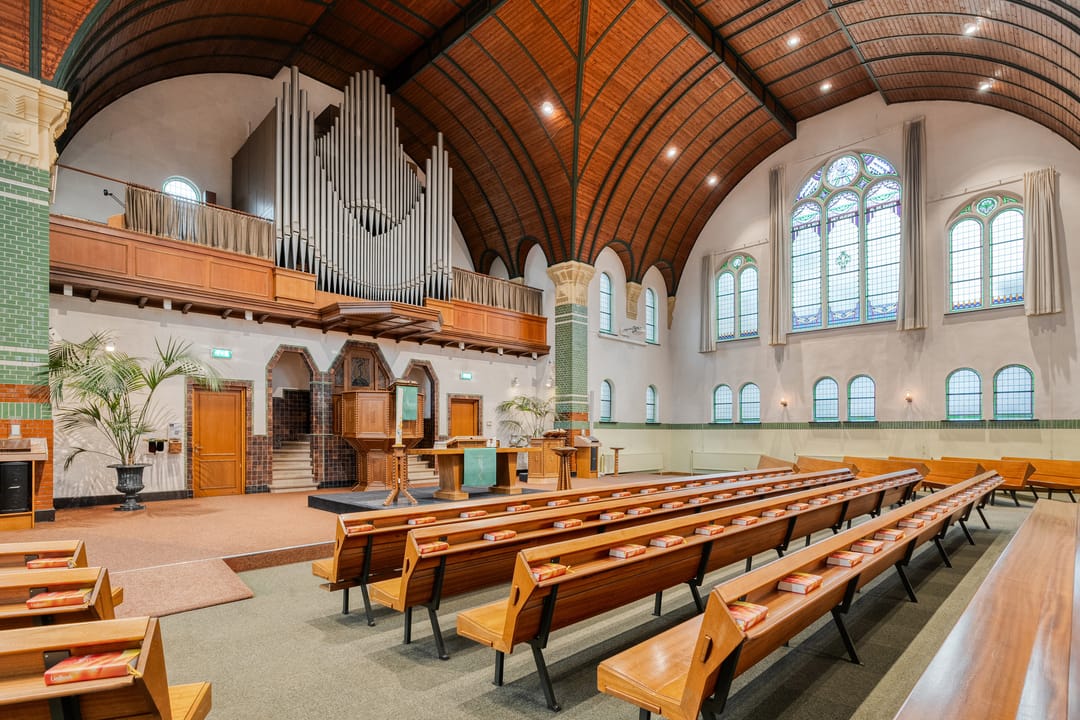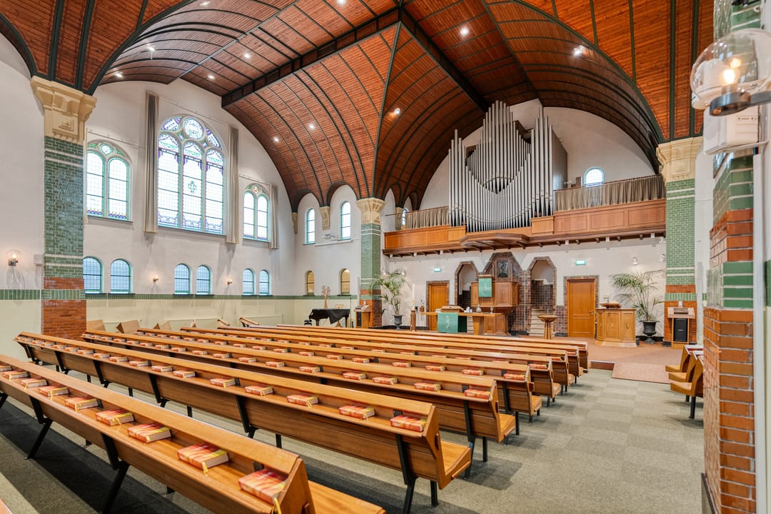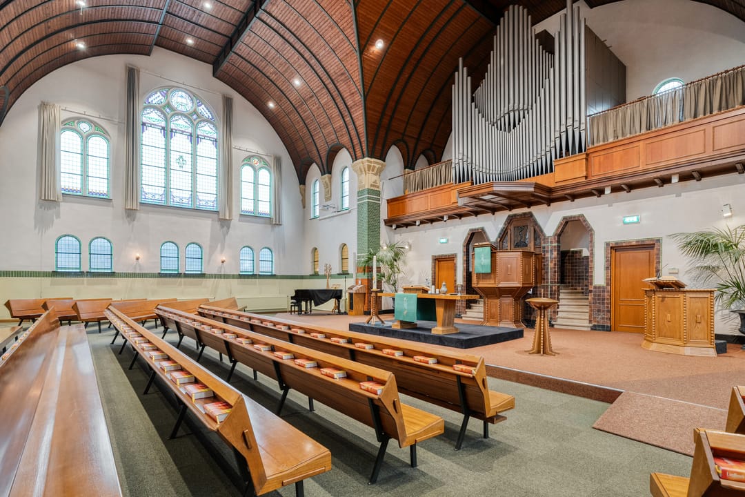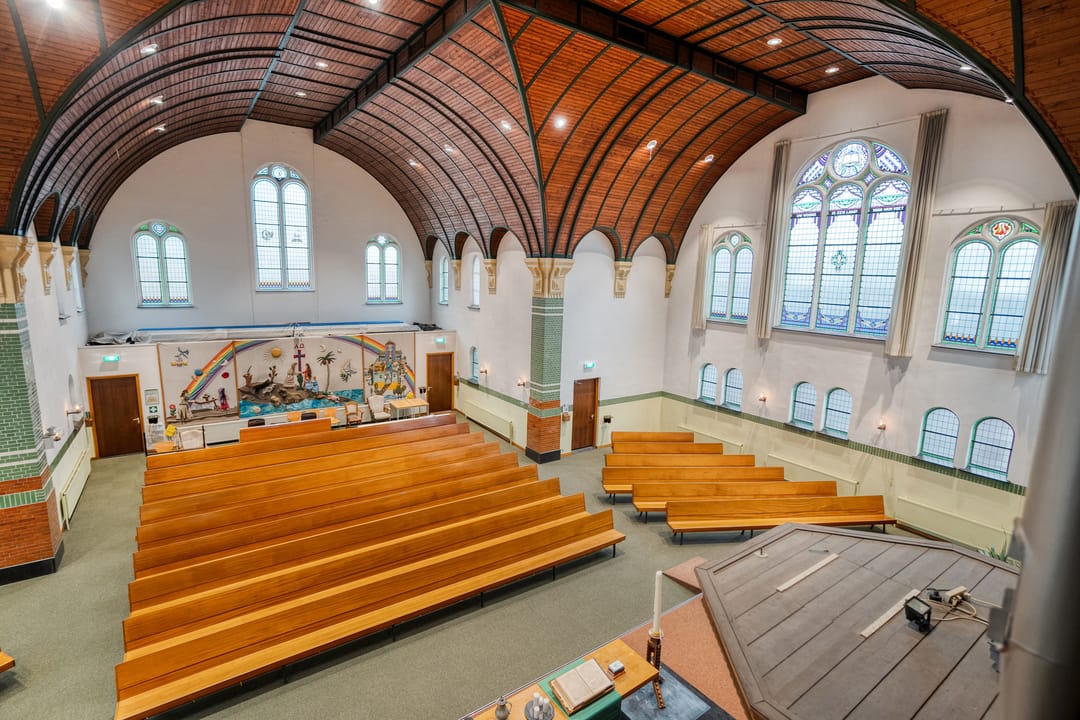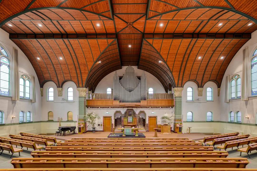 Royale driebeukige ruimte met houten tongewelf, gestucte wanden en karakteristieke glas-in-loodramen; geschikt voor vieringen, concerten en grotere bijeenkomsten.