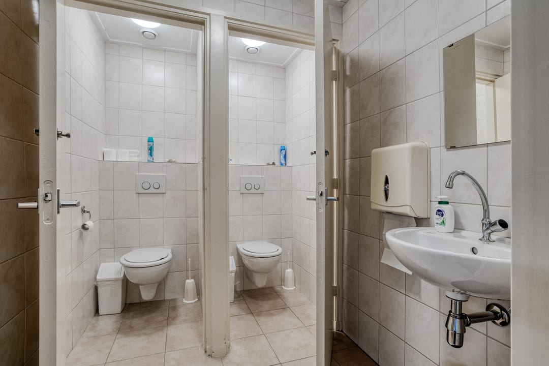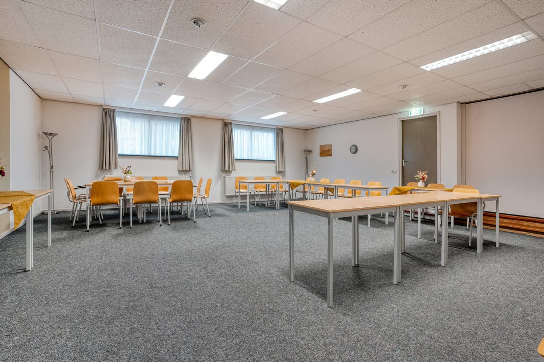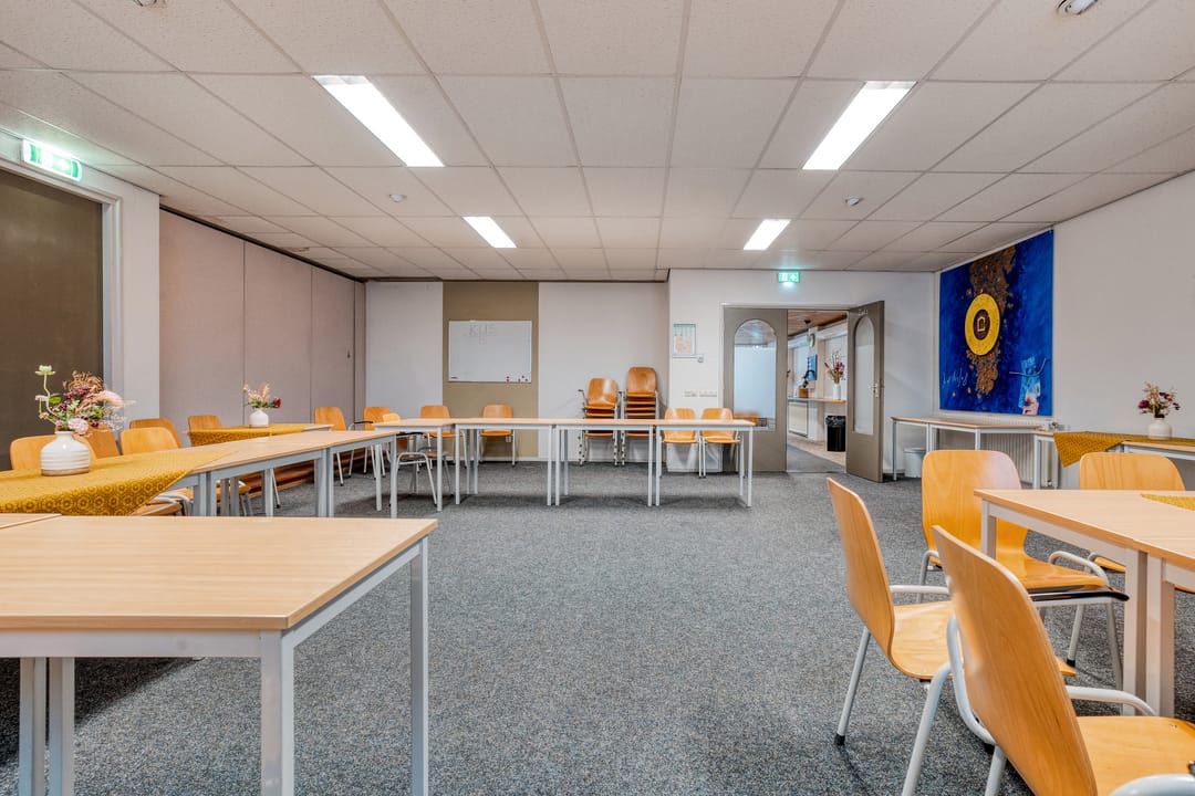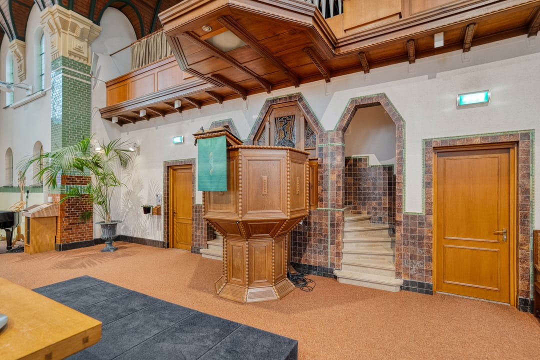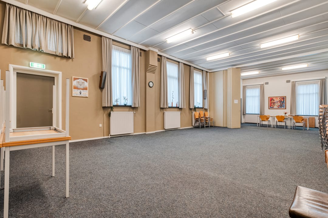 Aansluitend op de kerk liggen, achter de kosterswoning, meerdere zalen in uiteenlopende afmetingen. Deze zijn voorzien van een praktische keuken/pantry, centrale toiletgroepen en aanvullende berging en techniekruimten. Het betreft een zelfstandig zalengedeelte met directe koppeling aan het kerkprogramma: functioneel opgezet en flexibel inzetbaar voor bijeenkomsten, cursussen en ondersteunende functies.