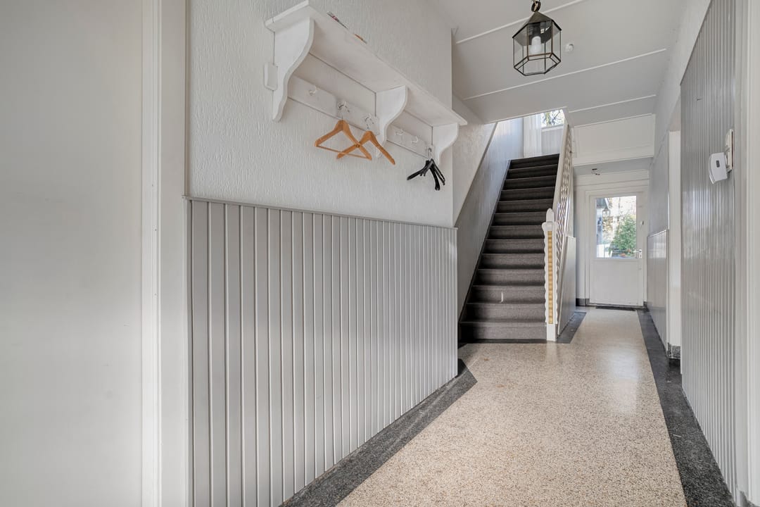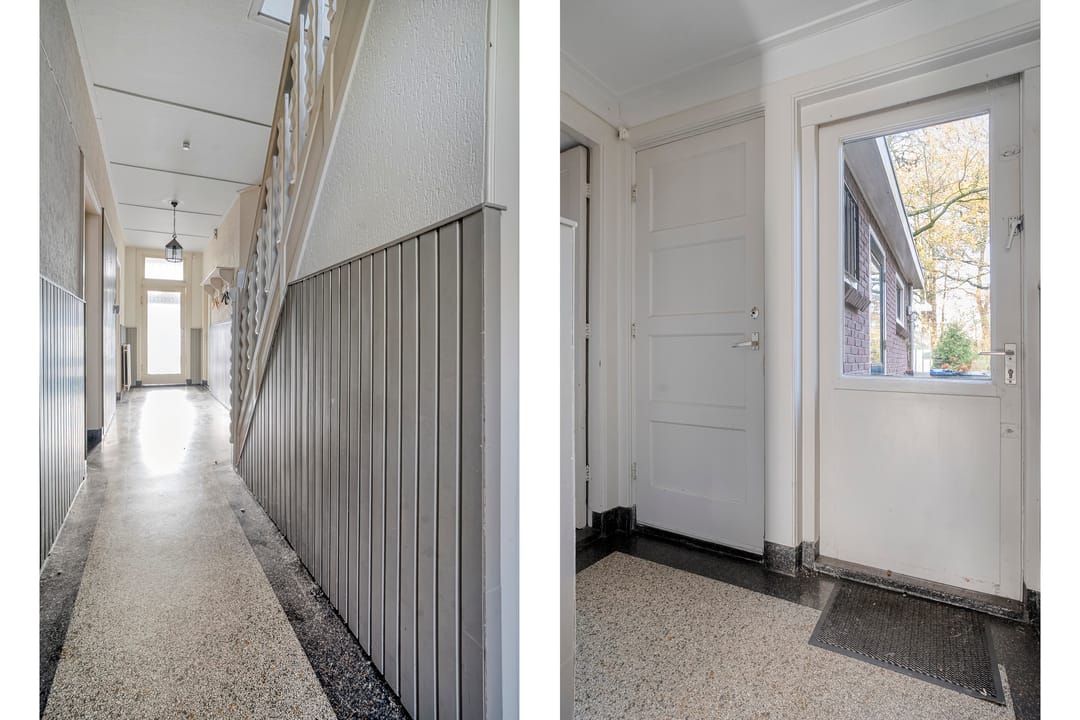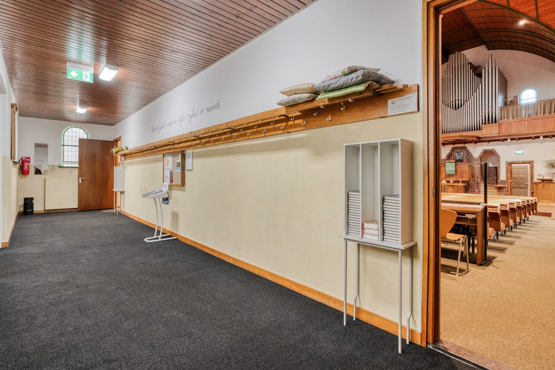 Representatieve hoofdingang met tochtportaal en garderobe, direct ontsloten naar kerkzaal, leerkamer en consistorie.