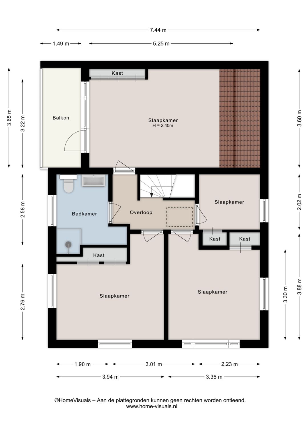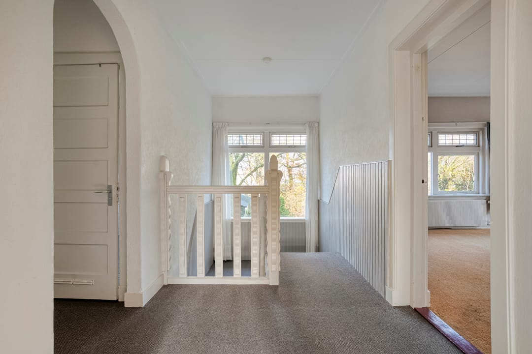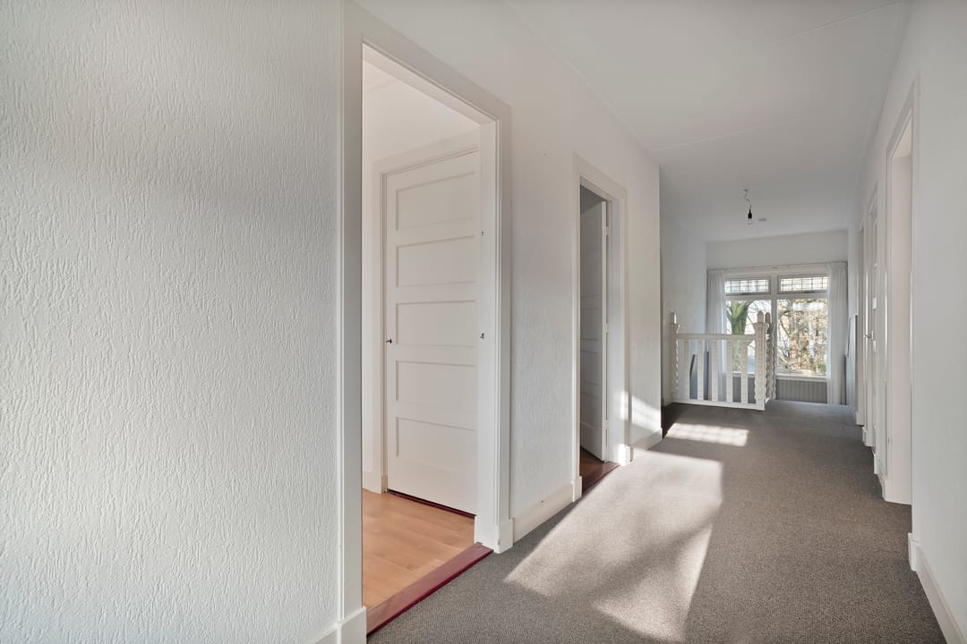 overloop, drie slaapkamers, studeerkamer en badkamer.