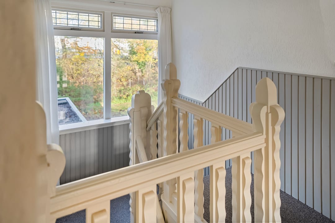 Overloop, vijf slaapkamers en badkamer (ligbad, douche, wastafel, toilet).