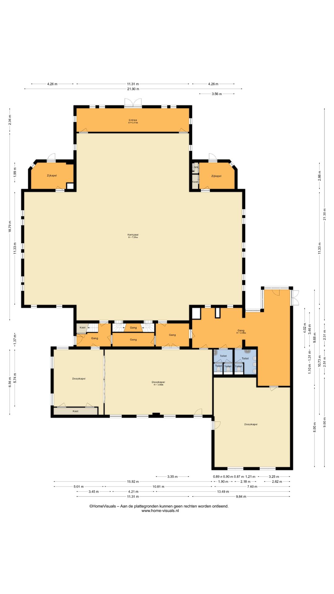 Ten behoeve van de verkoop zijn er meetrapporten opgesteld. In het meetrapport van het kerkgebouw vallen de volgende maten af te lezen: