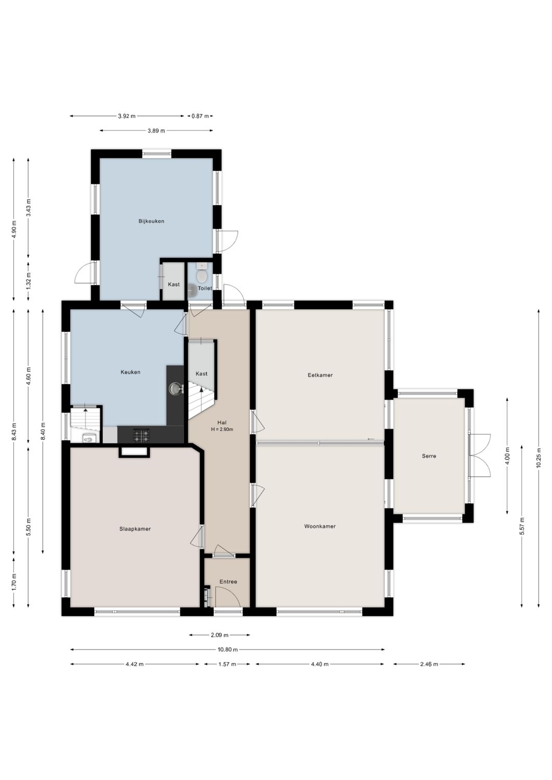 Entree met hal, studeerkamer, ruime woonkamer met serre, dichte keuken met toegang tot de provisiekelder, bijkeuken, achterentree en toilet.