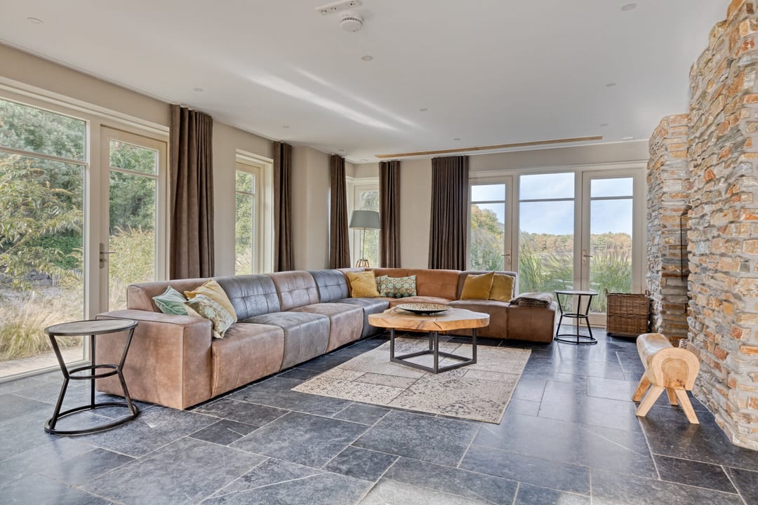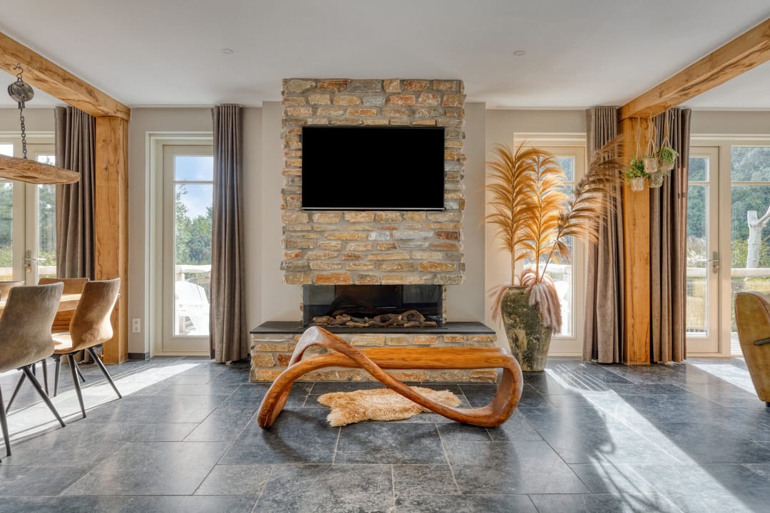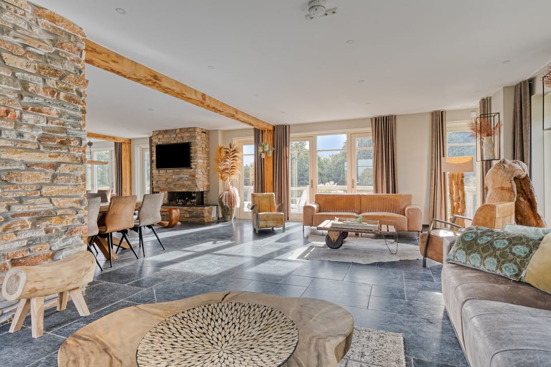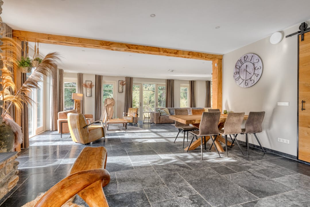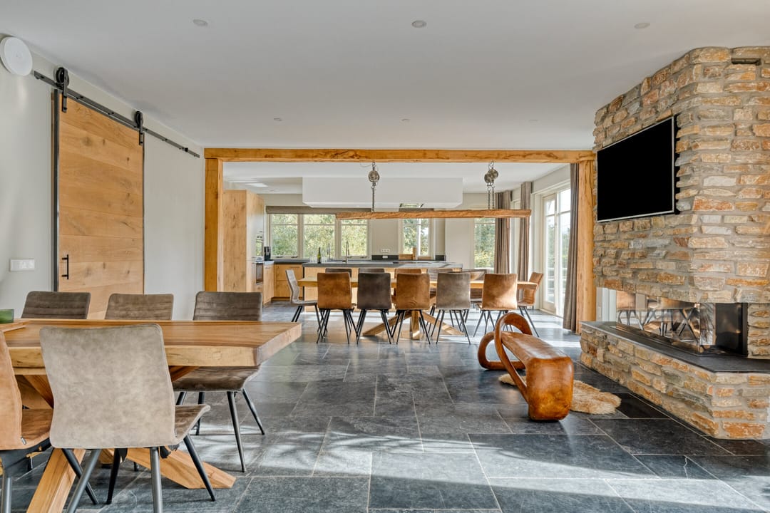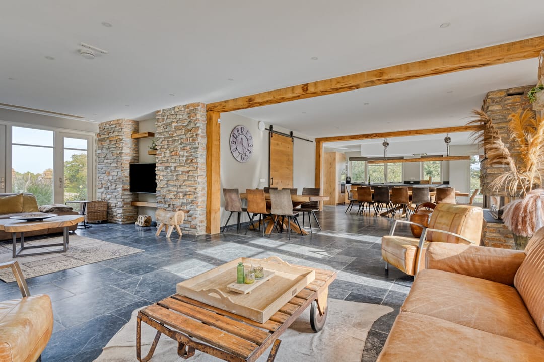 De woonkamer is een sfeervolle en lichte ruimte, voorzien van een moderne gashaard en comfortabele vloerverwarming, wat bijdraagt aan het aangename woonklimaat, ook in de wintermaanden. De ruimte wordt omringd door maar liefst zes (openslaande) deuren naar het terras, waardoor binnen en buiten naadloos in elkaar overlopen. Dankzij de vele ramen en deuren is de woonkamer bijzonder licht en voelt deze open en ruimtelijk aan. De combinatie van hout- en natuurelementen, geeft de ruimte een warme, bijna mediterrane sfeer, stijlvol, uitnodigend en karaktervol. Daarnaast zijn er al aansluitingen voorbereid voor het ophangen van een beamer, wat deze ruimte ook zeer geschikt maakt voor filmavonden of presentaties.